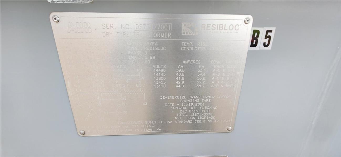 ABB dry-type transformer, mod. ResiBlock, ser. no. DS77977001 (2006), 1000/1333 kva, 60 hz, 3 ph, 95 HV/10 LV, 962/1283A w/ 118 ITM intelligent transformer monitor [TAG 81]
