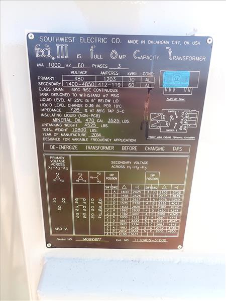 SouthWest Elec. Co. FACT III Full-Amp Capacity Transformer, mod. 71104C5-31000, ser. no. 1409101177 (2014), 1000KVA, 60Hz 3pH, Primary - 480V/1203A, Secondary - 1400-4850V/412-119A (NEW) [TAG 4882]