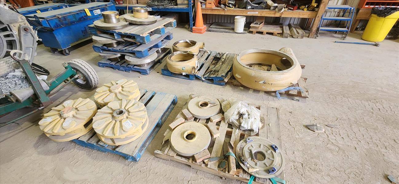 (7 skids) Weir Warman spare pump parts: impellers, throat bushes, volute liners, etc. [TAG 1440 / LOC 963243-2]
