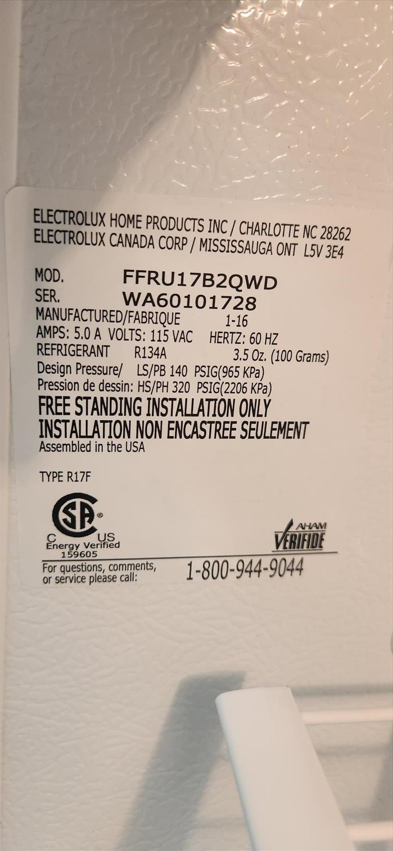 Fridgidaire Refrigerator mod. FFRU17B2QWD, S/N WA60101728