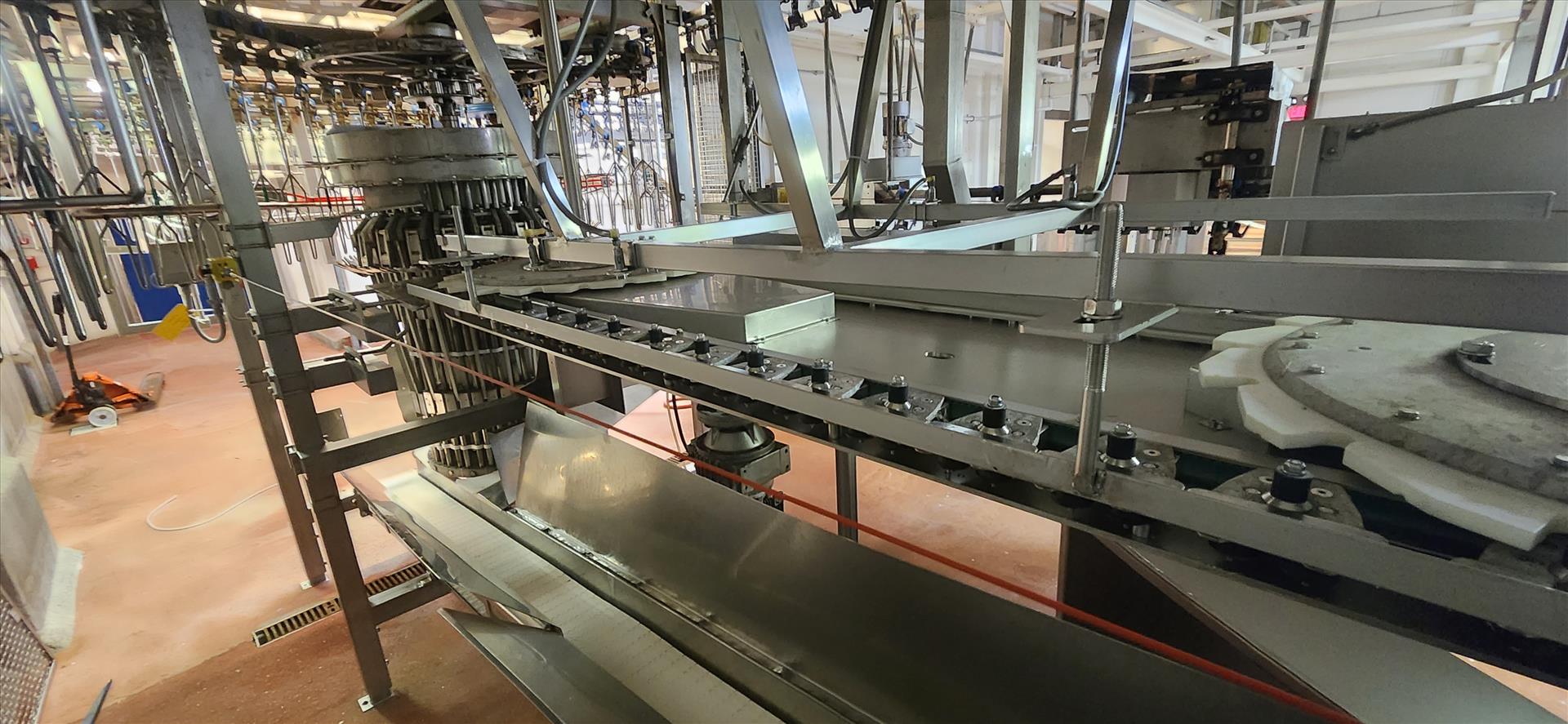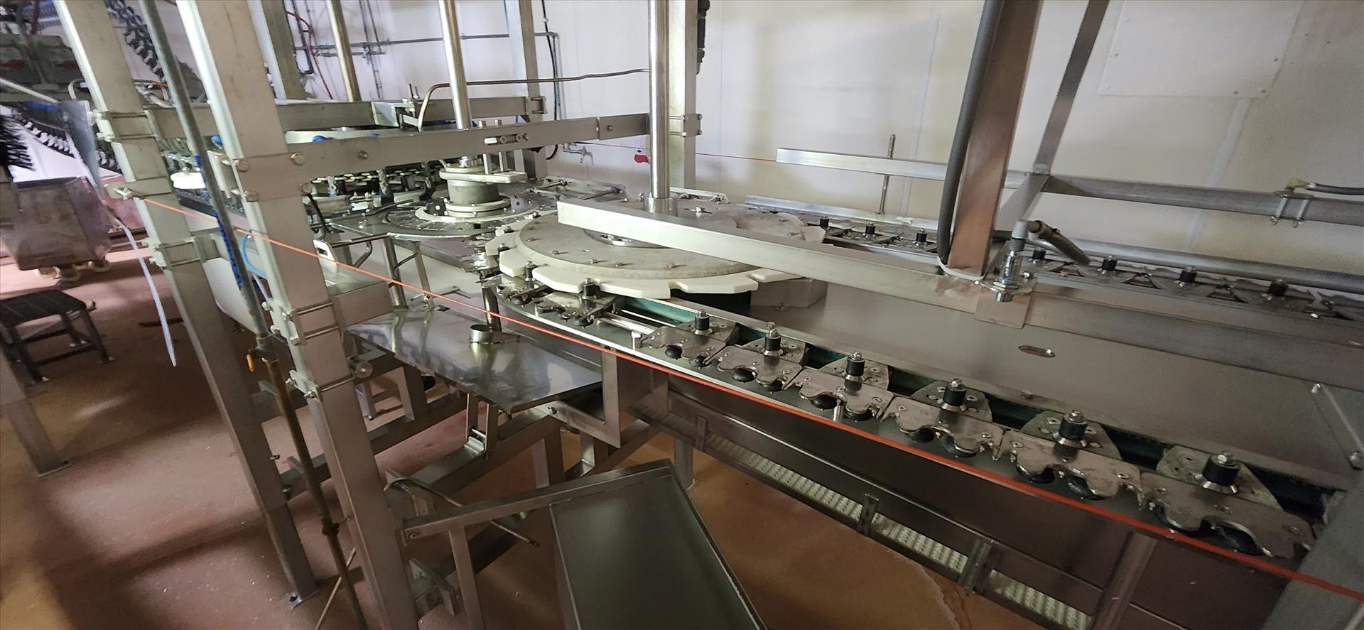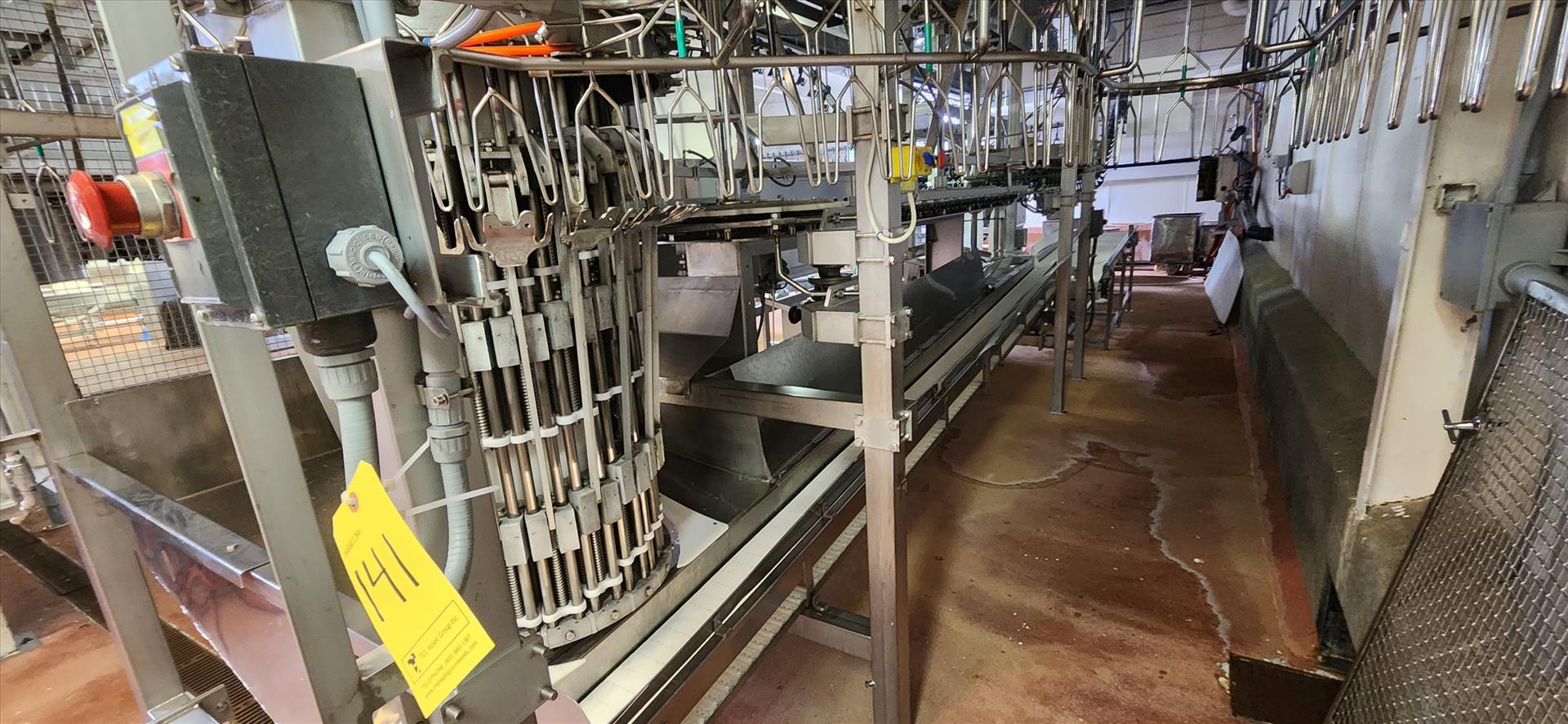 overhead conveyor transfer unit c/w conveyor, belt, stainless steel frame, wash down motor, approx. 9 in. x 18 ft. [Loc. Whole Bird]