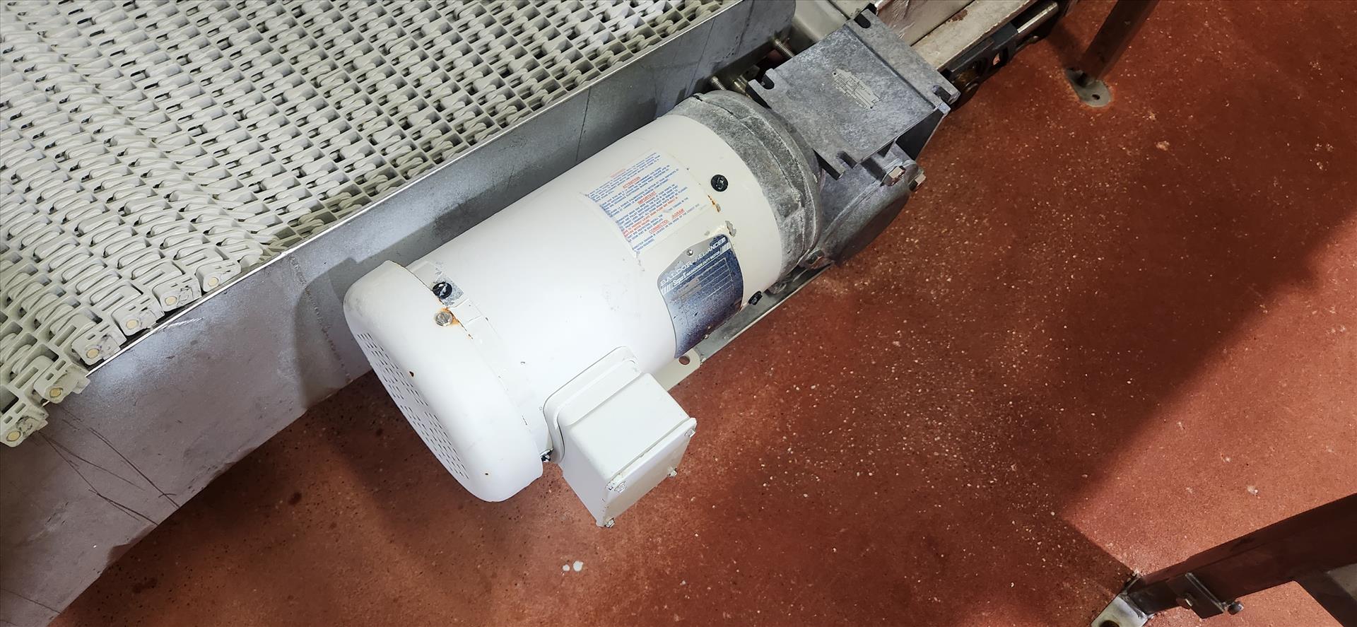 box conveyor, belt, stainless steel frame, 90 deg. turn, power, approx. 19 in. x 34 ft. [Loc. Cut-Up]