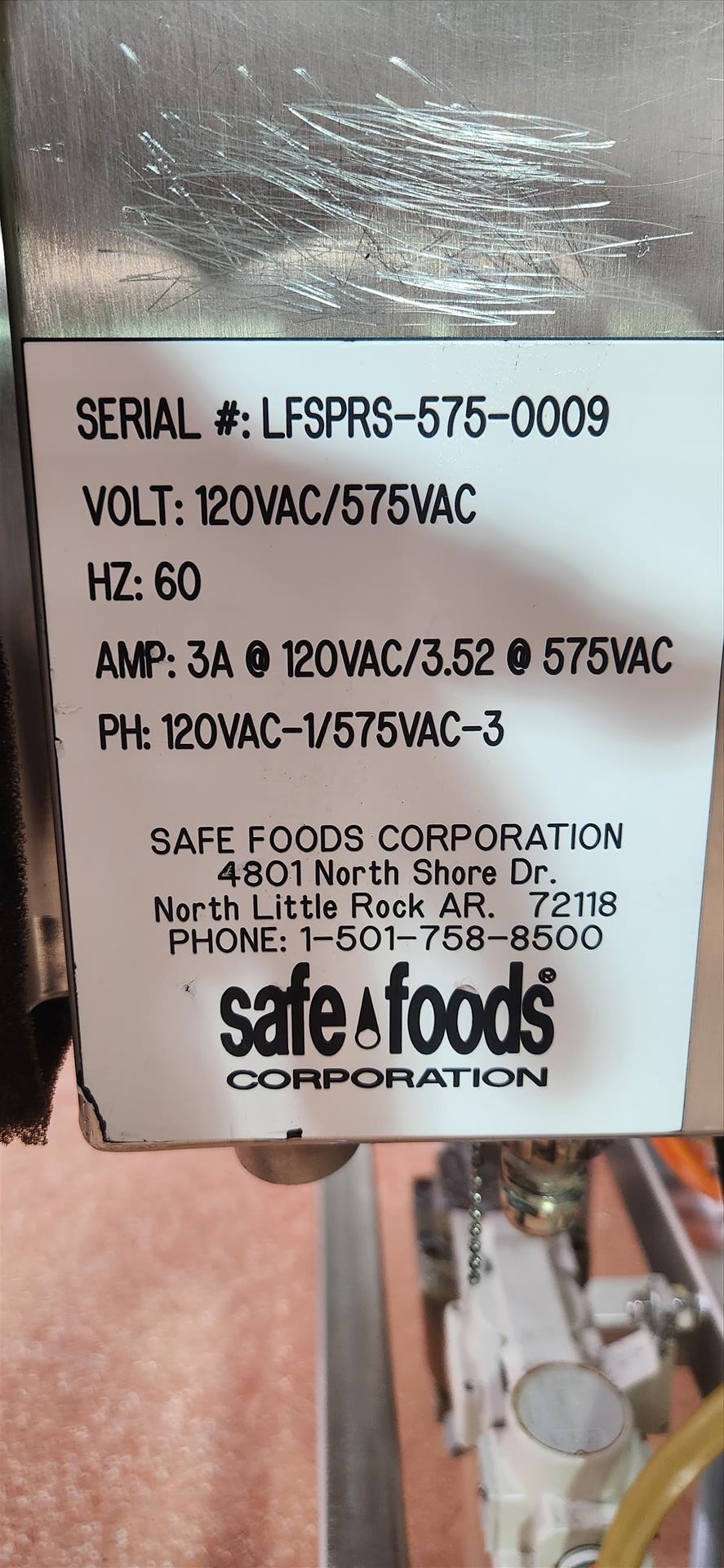 Safe Foods waste water extractor, ser. no. LFSPRS-575-0009, stainless steel [] [Loc. ]