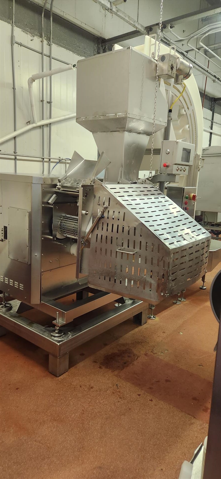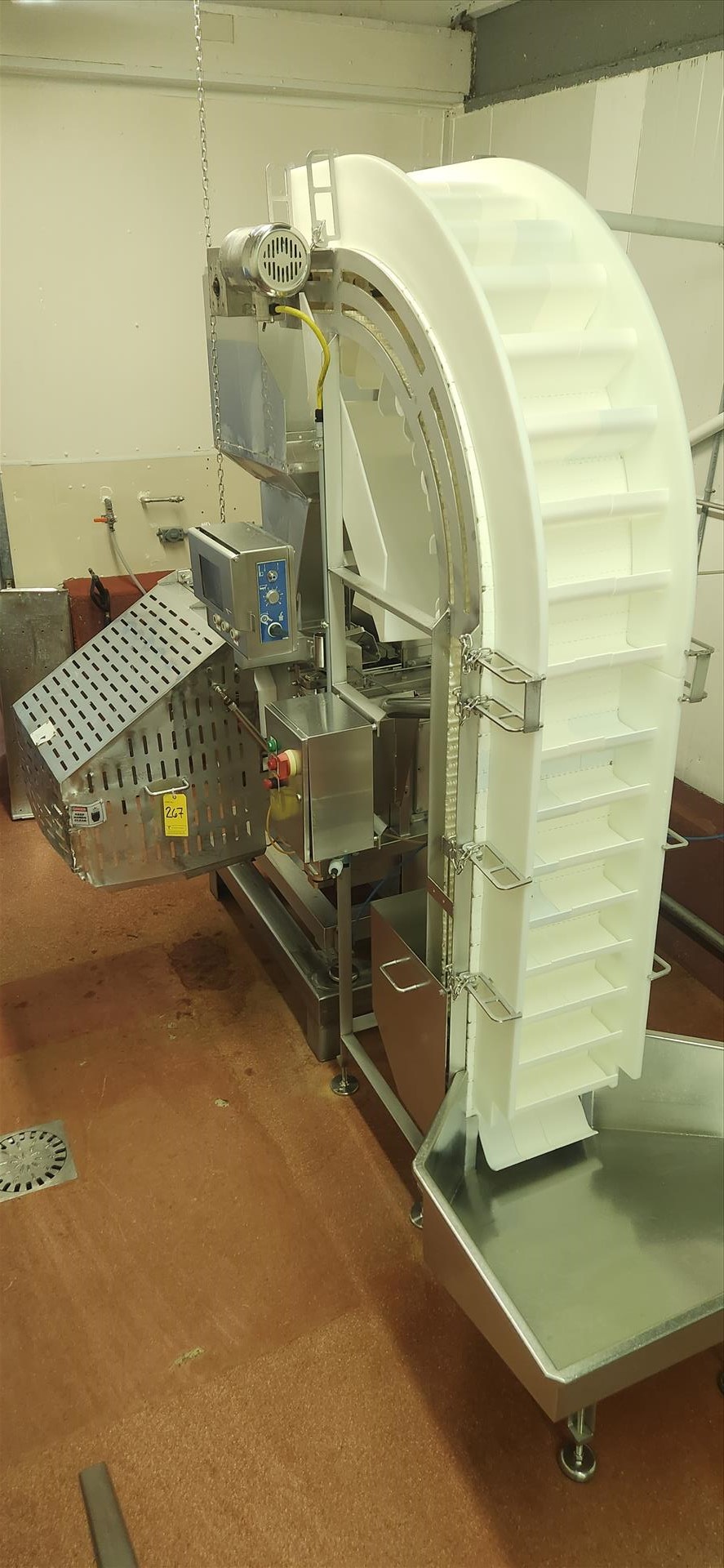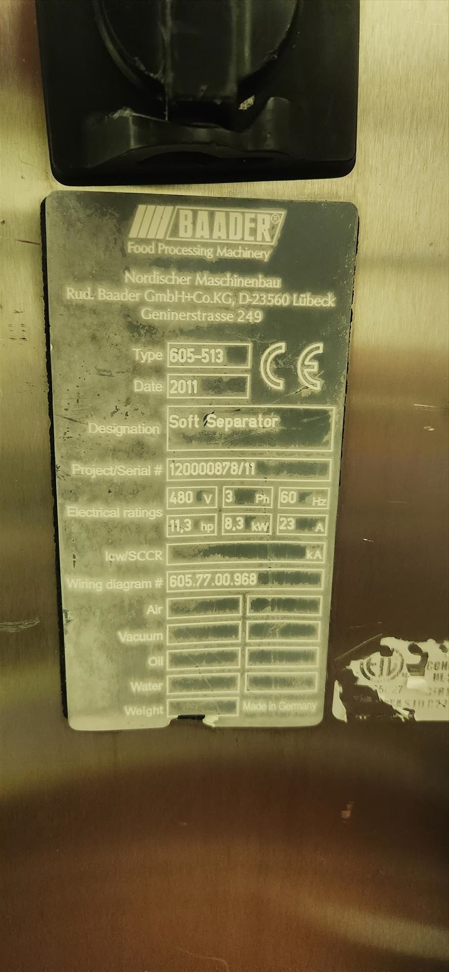 Baader desinewing/soft separator, mod. 605-513, ser. no. 120000878/11 c/w elevator conveyor, power, 14 in., stainless steel [Loc. Grounds]