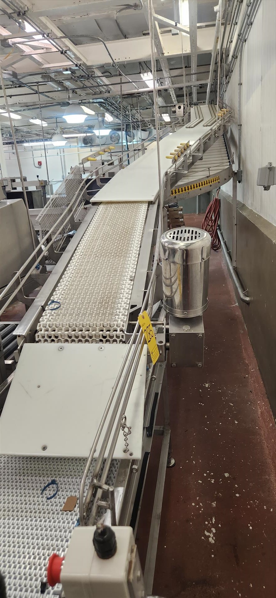conveyor, belt, inclined/suspended, stainless steel frame, power, approx. 13 in. x 55 ft. [Loc. Grounds]
