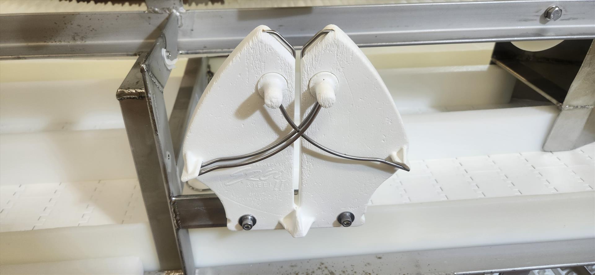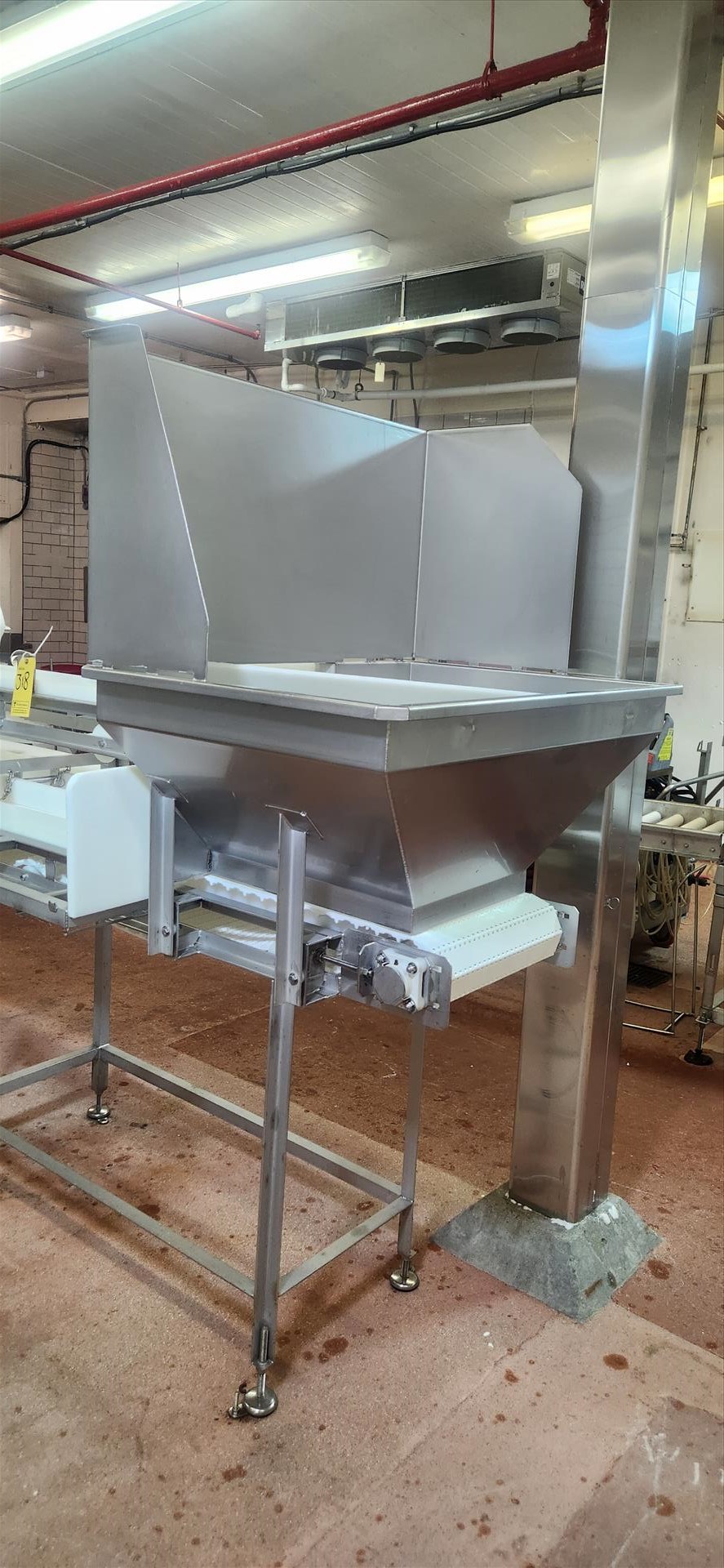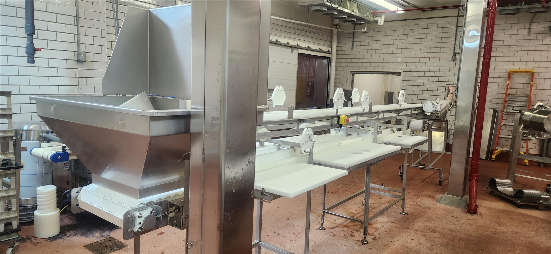 trim table conveyor, belt, stainless steel frame, wash down motor, approx. 18 in. x 14 ft. w/ top conveyor, belt, approx. 3 in. x 15 ft. and hopper [Loc. Portion Pack]