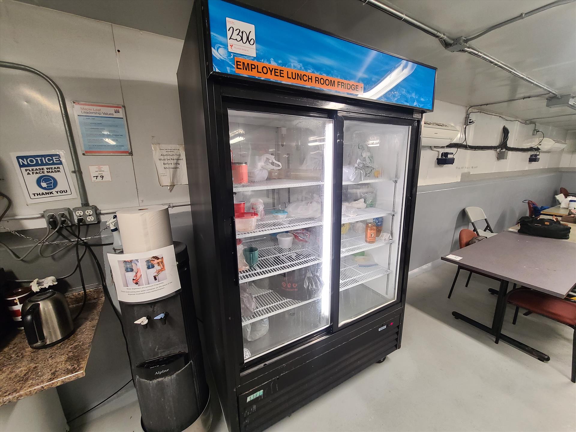 Black upright merchandiser fridge, double doors (Employee Lunchroom/Cafeteria) [109 Ryding Avenue]