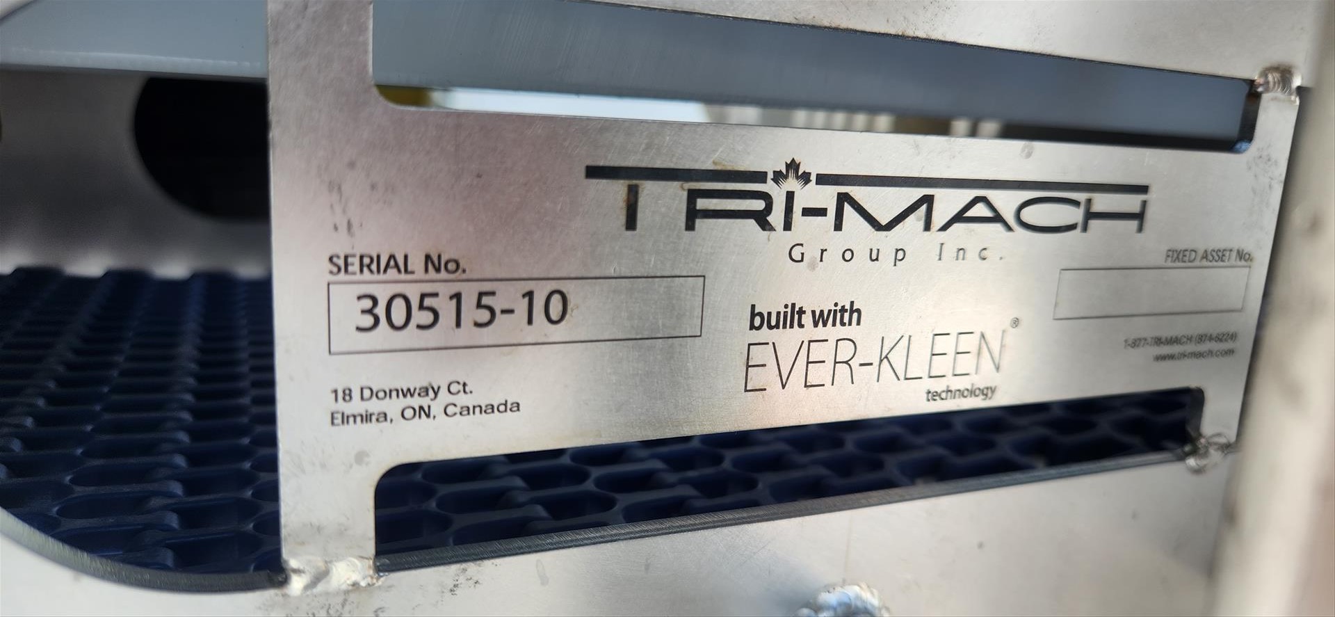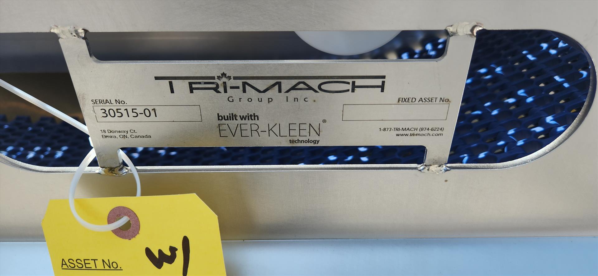 Tri-Mach Ever-Kleen conveyor, ser. no. 30515-01, belt, approx. 9 in. x 28 ft., stainless steel frame, (2) 90 deg. turns (no motor) and belt, approx. 10 in. x 33 ft., stainless steel frame, (2) 45 deg. Turns (no motor) w/ casters
