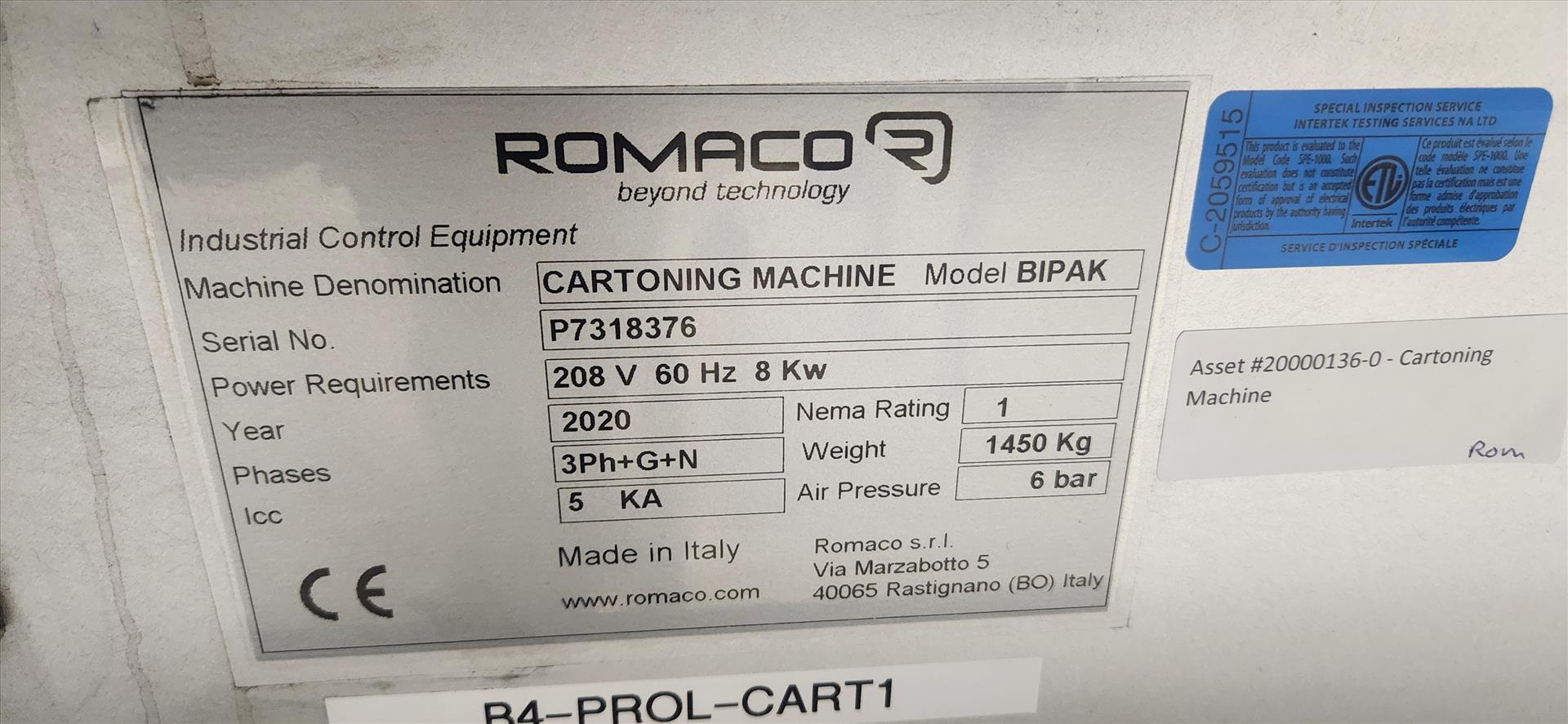 Romaco cartoner, mod. BiPak, ser. no. P7318376 (2020), stainless steel c/w Nordson ProBlue4 hot melt (rigging required) [Loc. B4, Flowering 16]