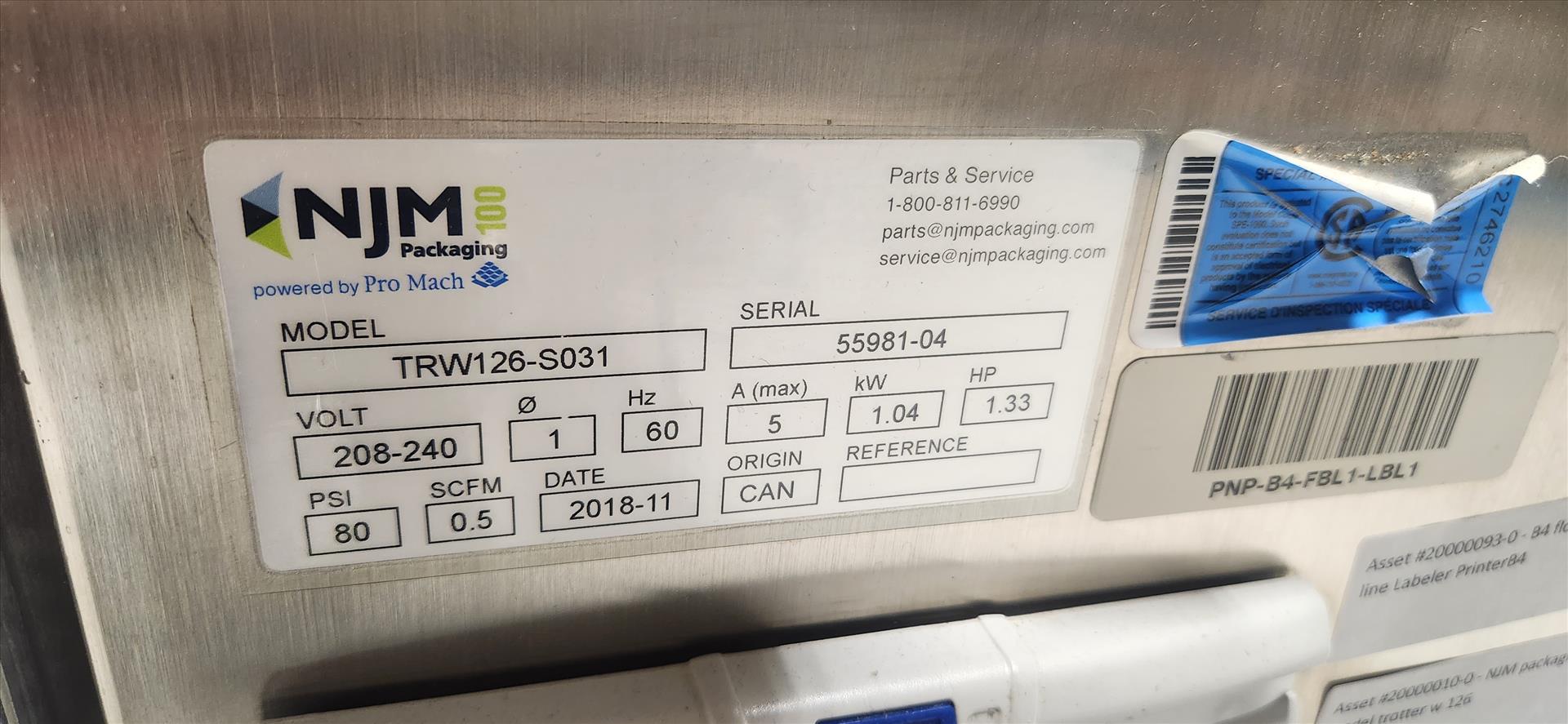 NJM Promach Trotter W126 labeller, mod. TRW126-S031, ser. no. 55981-04 (2018) c/w Markem Image SmartDataX60 coder and Optel LineMaster/PharmaProof controls, stainless steel (rigging required) [Loc. B4, Flowering 16]