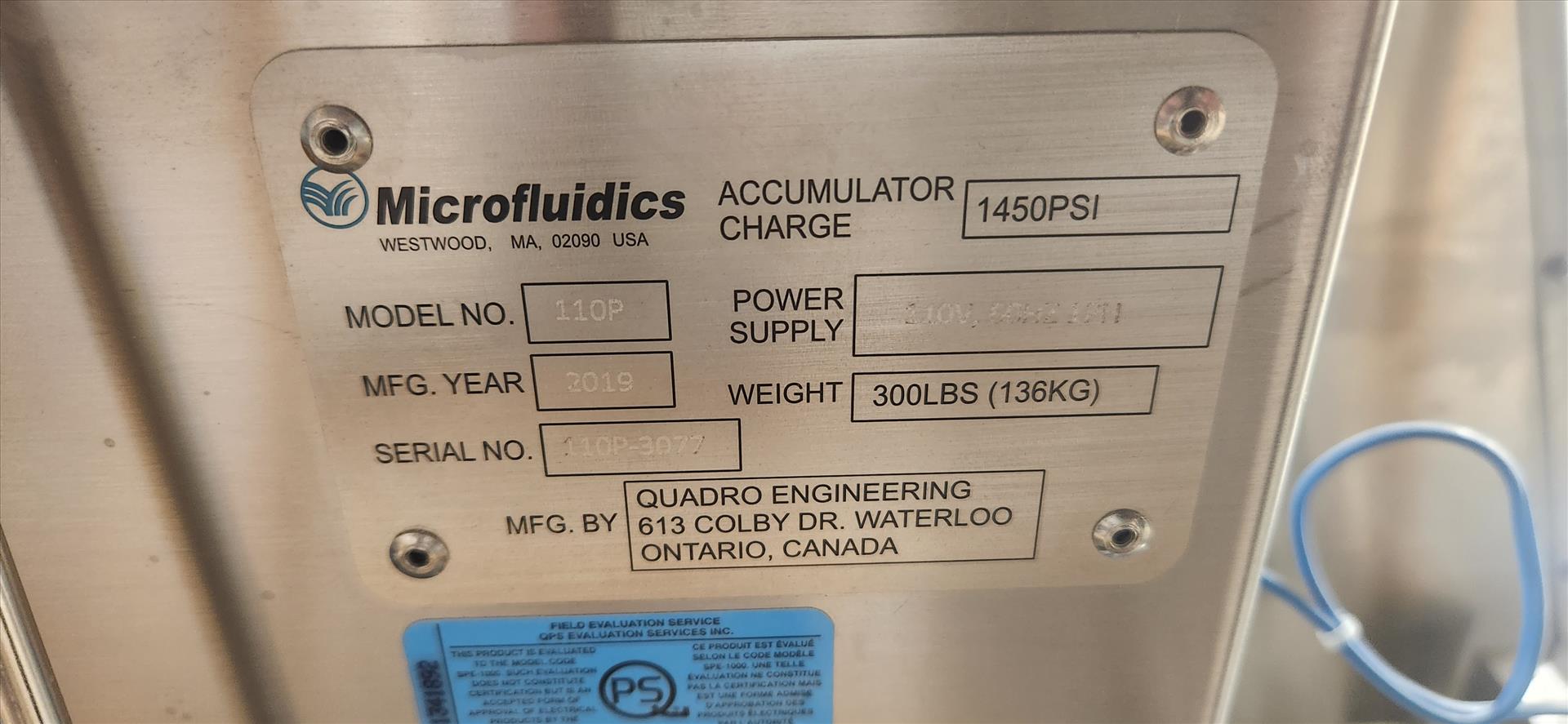 MicroFluidics benchtop laboratory homogenizer, mod. M-110P, ser. no. 110P-3077 (2019), stainless steel [Loc. B5, Greenhouse]