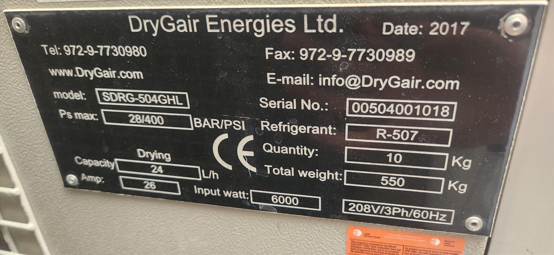 DryGair greenhouse dehumidifier, mod. SDRG-504GHL, ser. no. 00504001018 (2017), 24L/hr. [Loc. B5, Greenhouse]