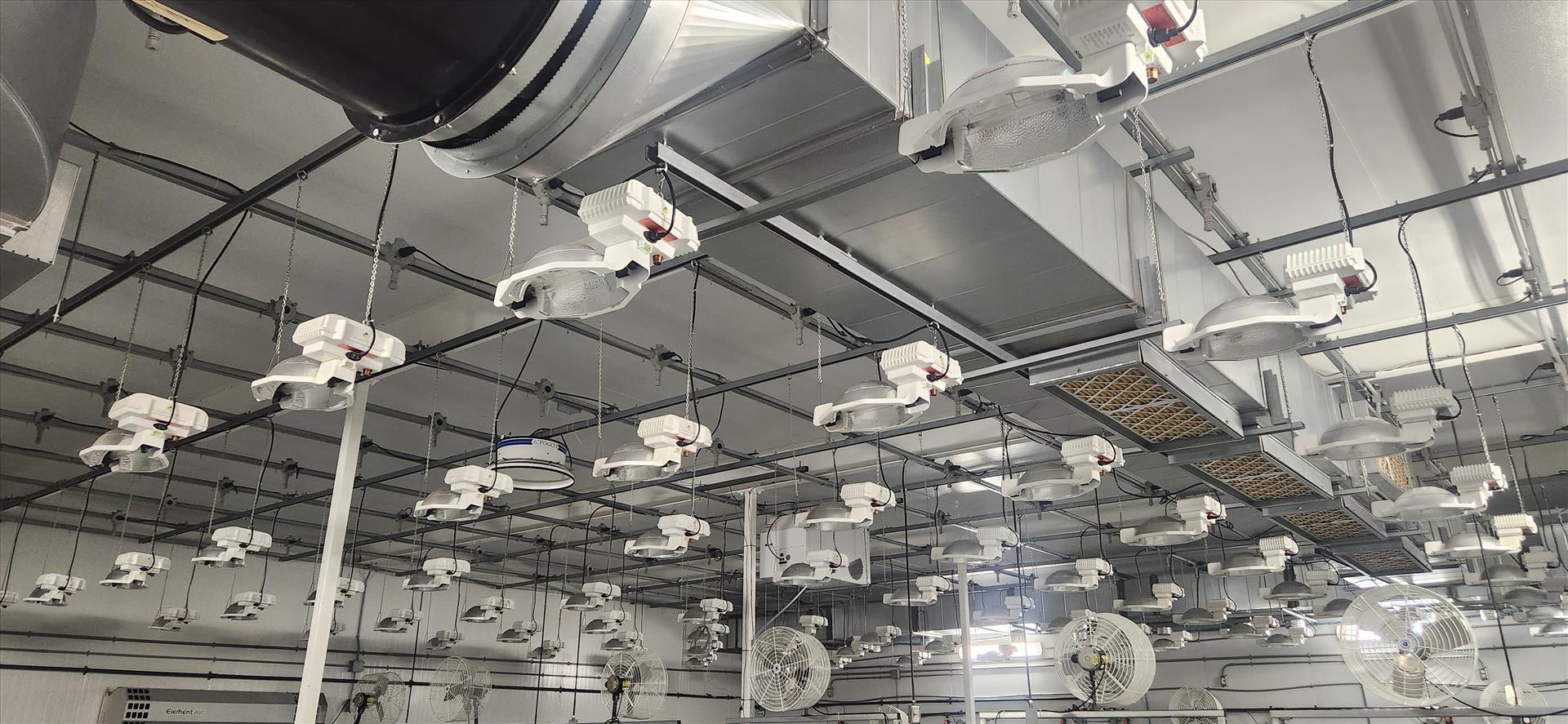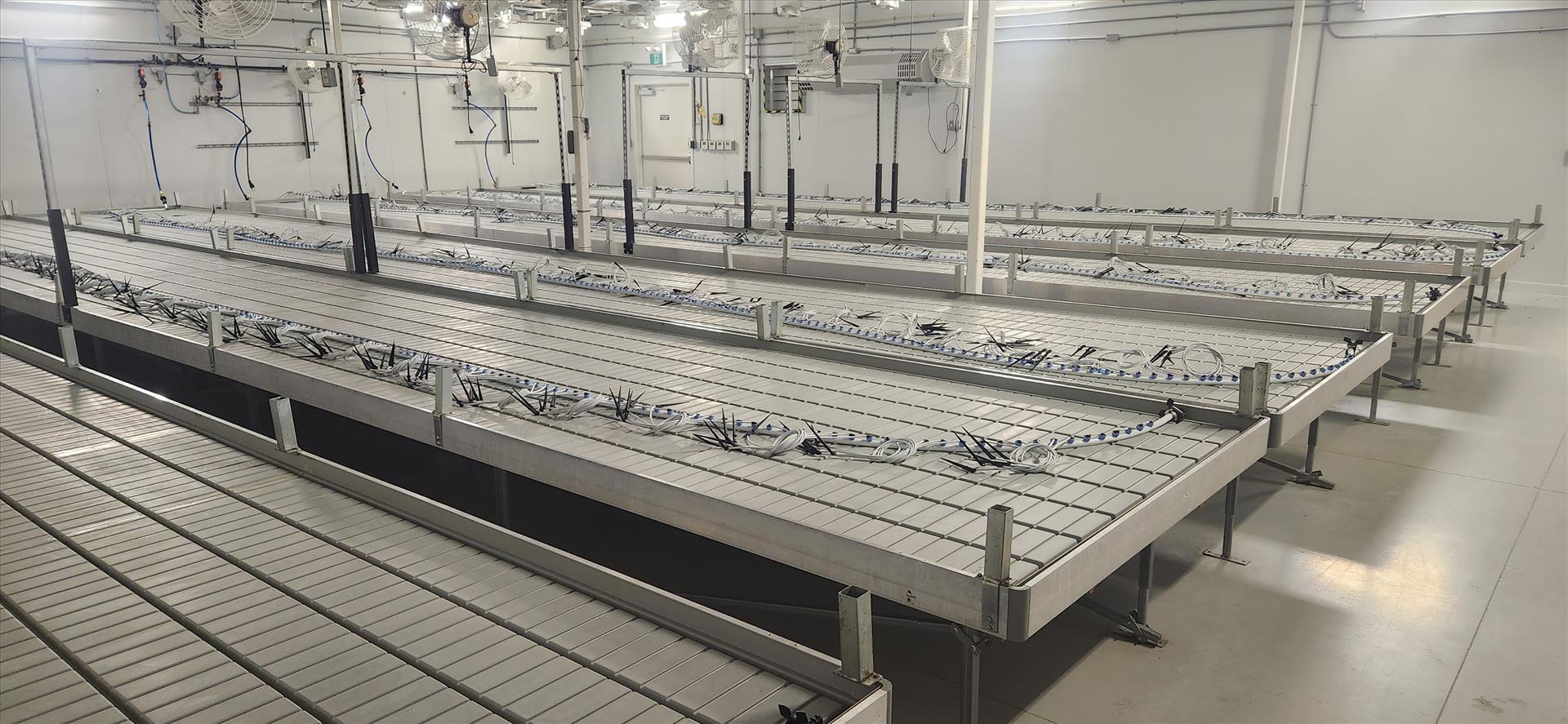 contents of grow room, incl.: (6) ebb and flow grow benches, approx. 66 in. x 42 ft. ea., (72) P.L. NXTLP HPS grow lights, 1000W, (2) Elemental Air EA-T-WM-G2 air purifiers, (12) Shaeffer 24 in. fans, (1) Quest dehumidifier, (1) FogCo fogger, misc. irrigation piping w/ drip lines (due to space limitations, ebb and flow grow benches may require complete disassembly to remove from grow rooms) [Loc. B2, Flowering 2E]