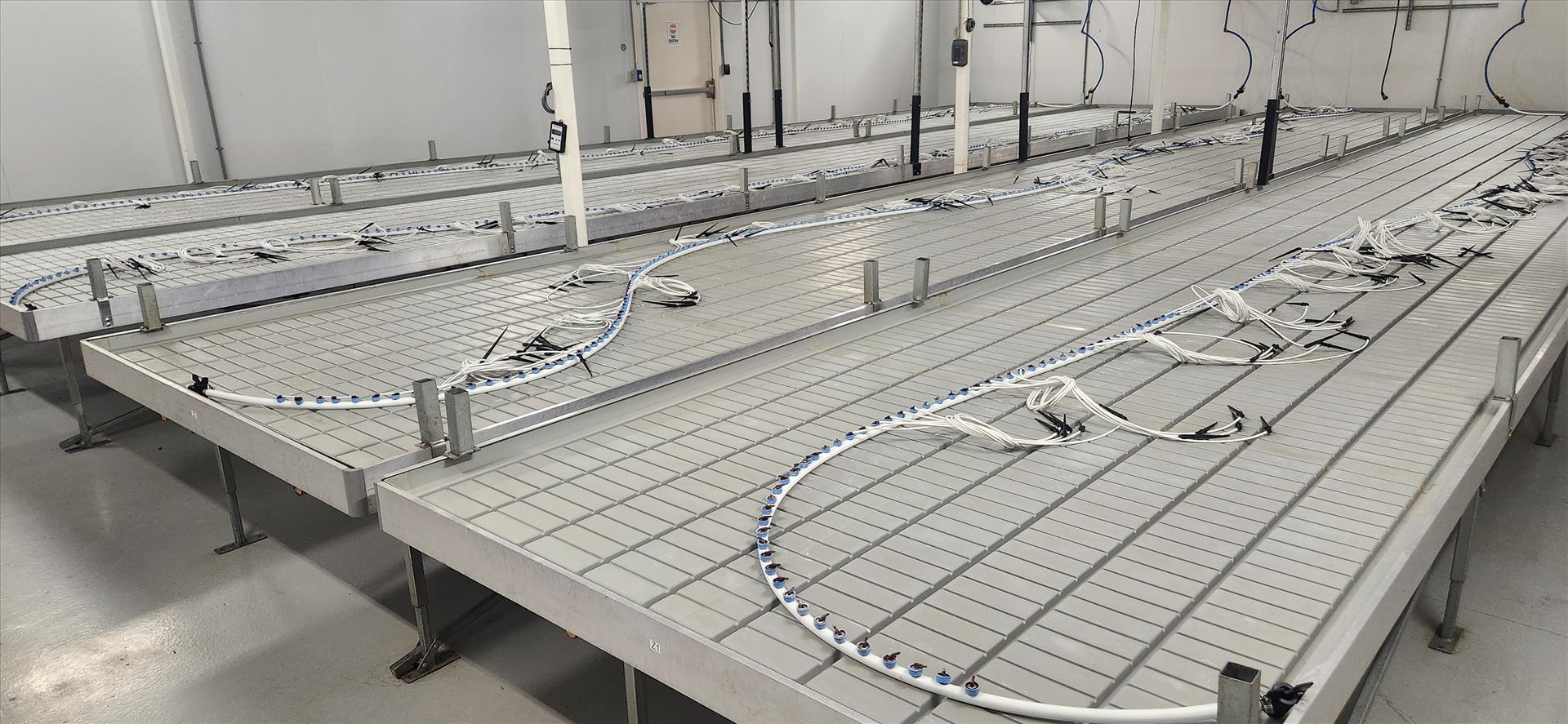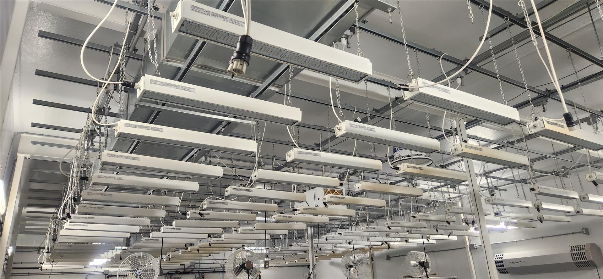 contents of grow room, incl.: (4) ebb and flow grow benches, approx. 66 in. x 42 ft. ea., (117) Hortiled Top LED grow lights, (1) Elemental Air EA-T-WM-G2 air purifier, (7) Shaeffer 24 in. fans, (1) Quest dehumidifier, (1) FogCo fogger, misc. irrigation piping w/ drip lines (due to space limitations, ebb and flow grow benches may require complete disassembly to remove from grow rooms) [Loc. B2, Flowering 2H]