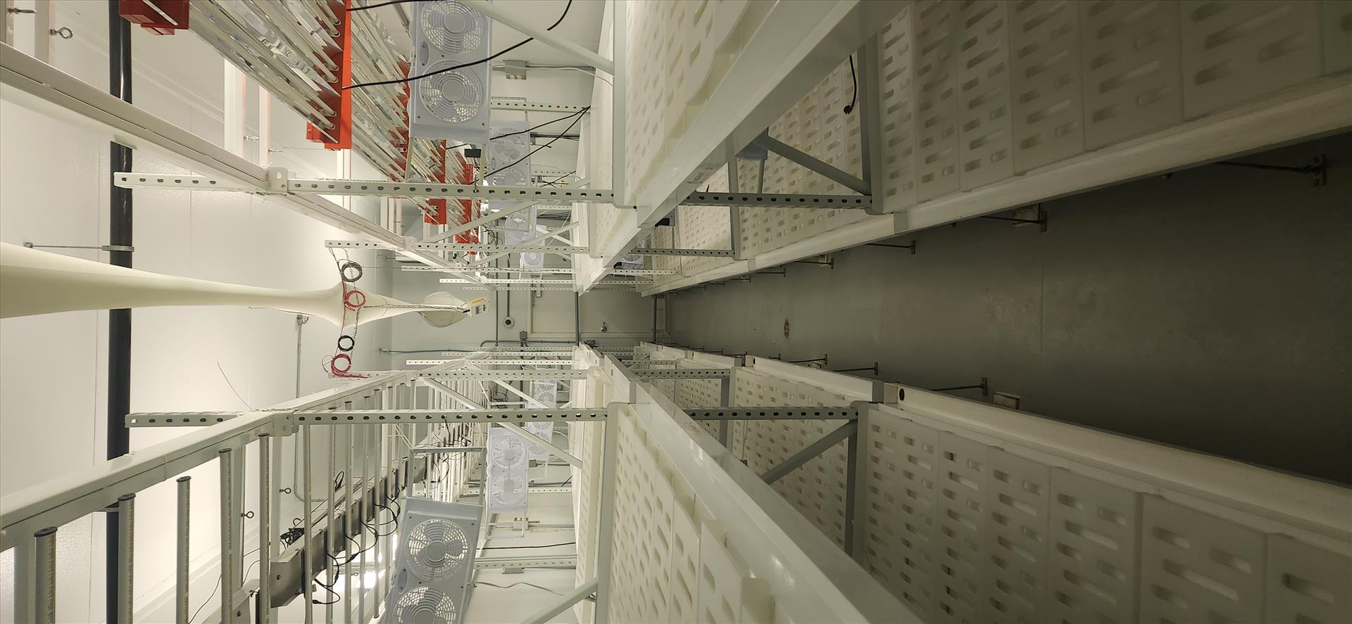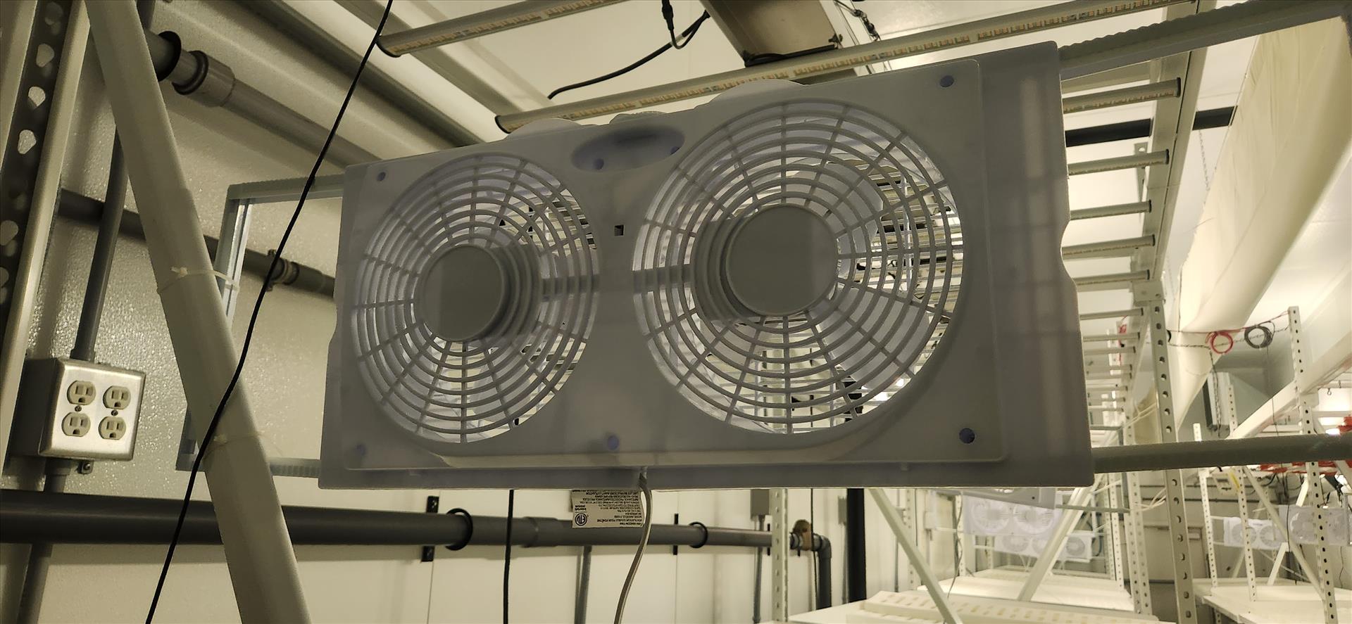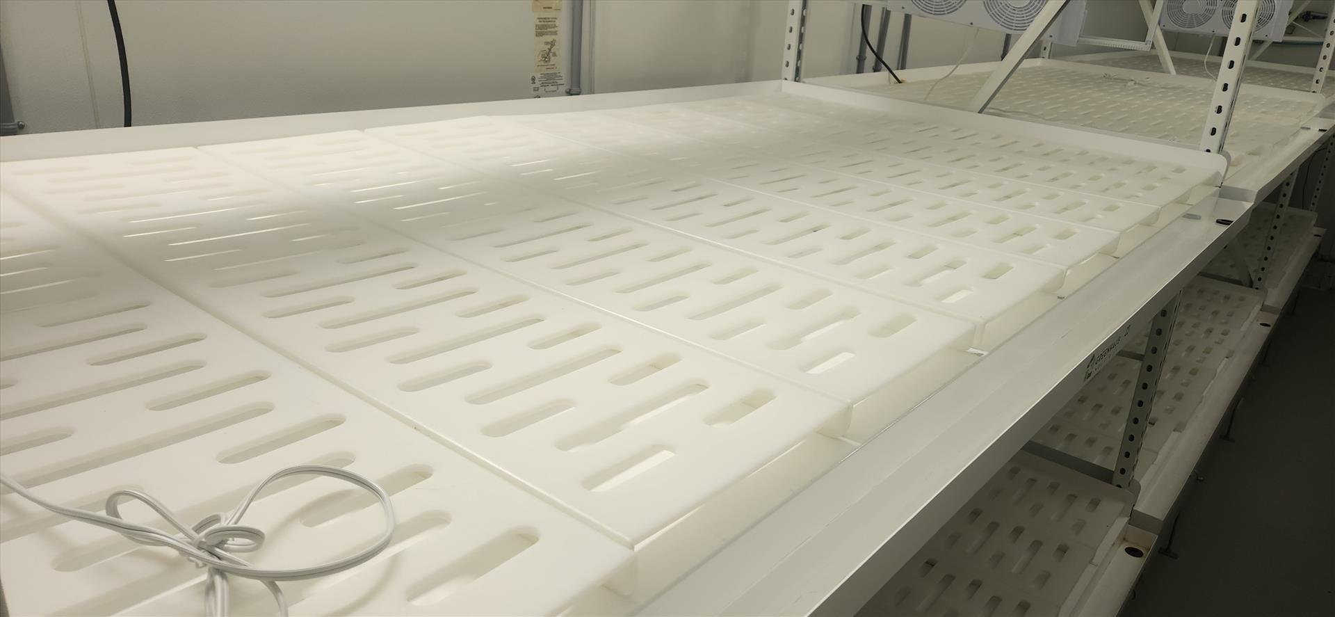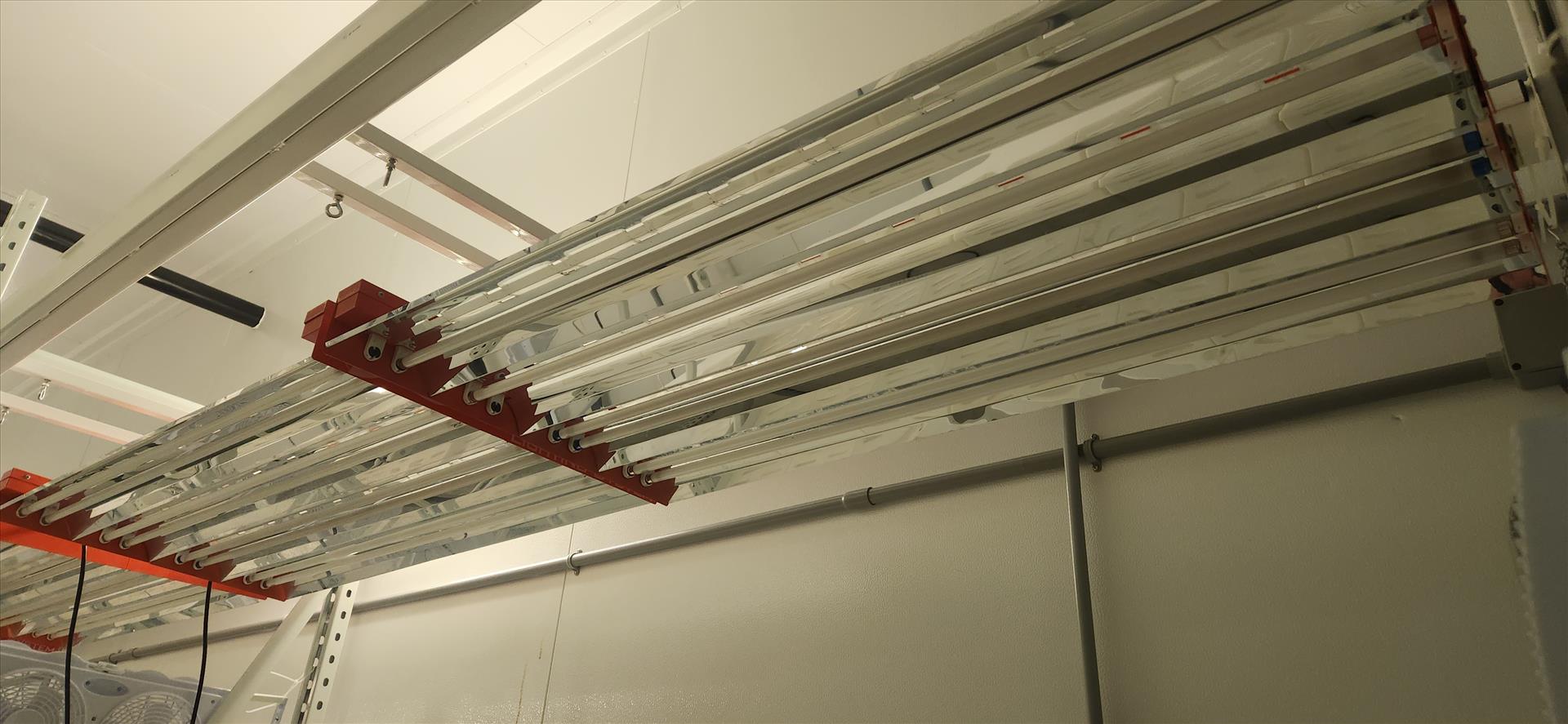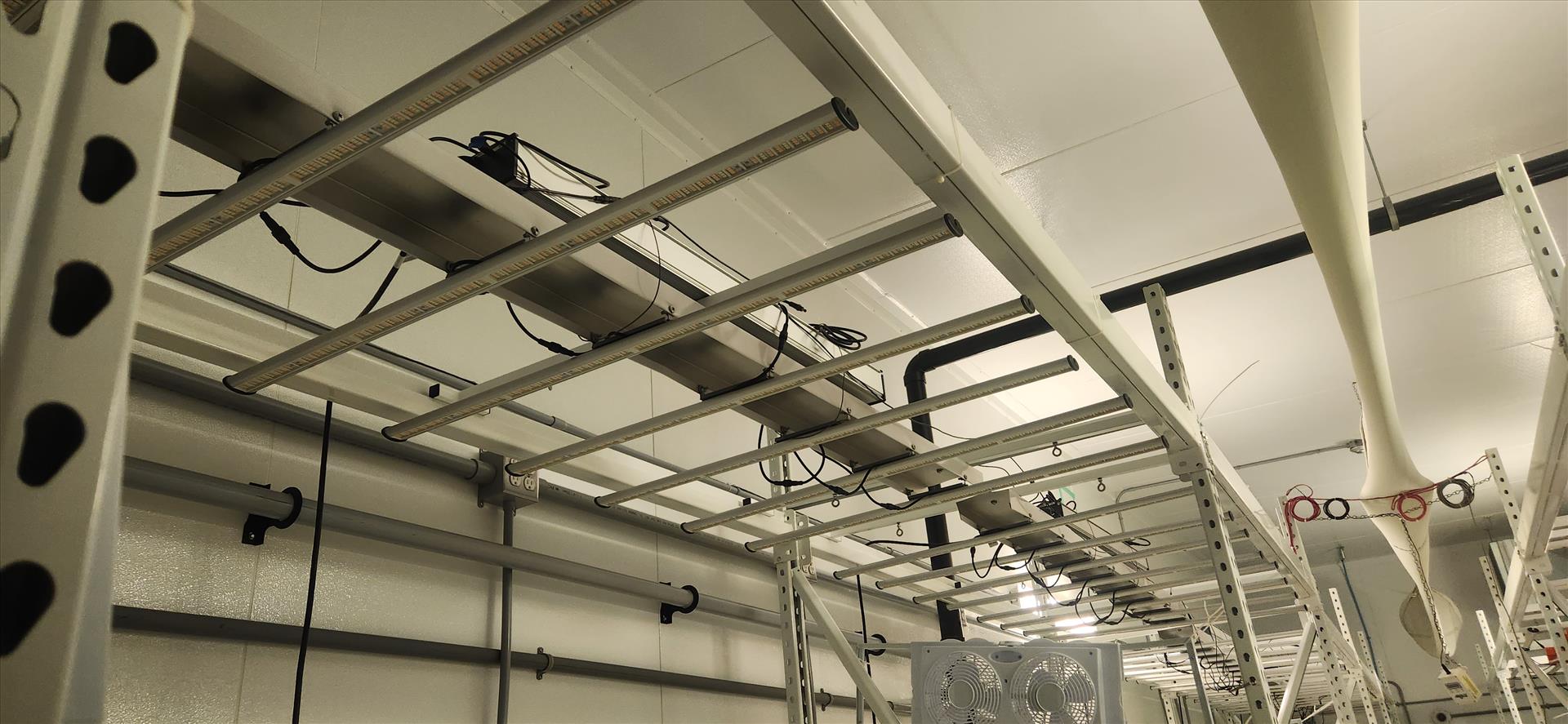 contents of grow room, incl.: (20 sec.) Greenhaus grow racking, approx. 4 ft. x 8 ft. x 10 ft. high c/w LED and Florecent Quantum lighting, (1) vent sock [Loc. B3, Vegetative 3E]