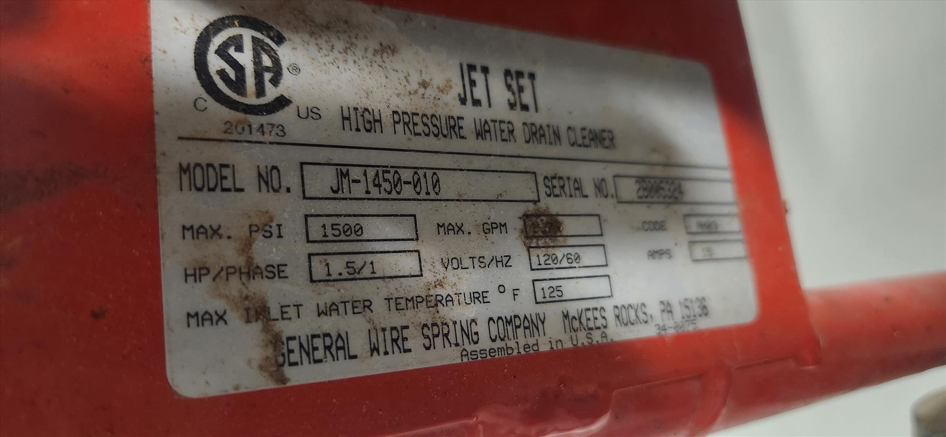 General Jet Set portable high pressure water drain cleaner, mod. JM-1450-010, ser. no. 28005324, 1.5 hp w/ Vibra-Pulse, hose reel [Loc. B4, Vegetative 8]