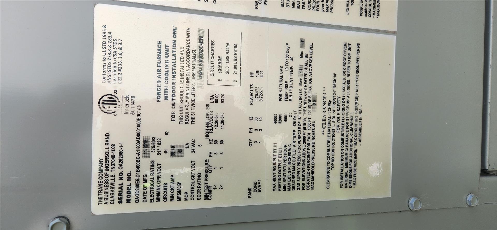 Trane forced air furnace, mod. OAGD24E5-D1B400BC-A1K00AD000B0C, ser. no. OA292980-1-1 (2019), LNG, 40000 btu/hr w/ cooling unit [Loc. Yard]