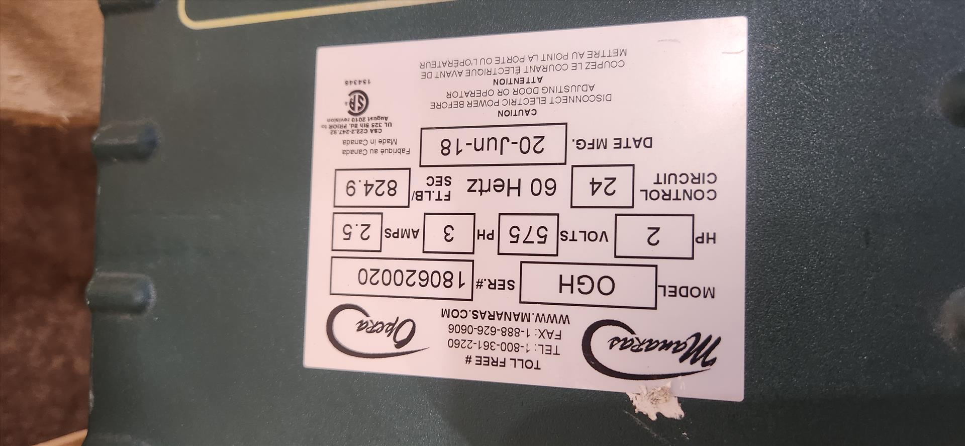 Manaras gear head operator, mod. OGH, ser. no. 180620020 (2018), 2 hp, 824.9 ft. lbs./sec. w/ hoist [Loc. B5, Greenhouse]