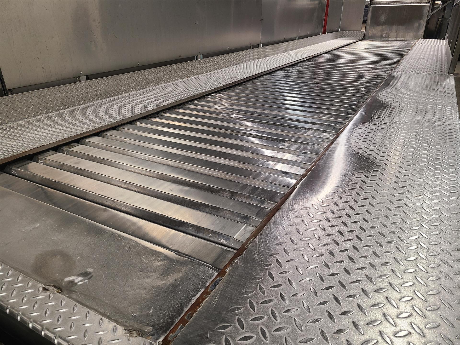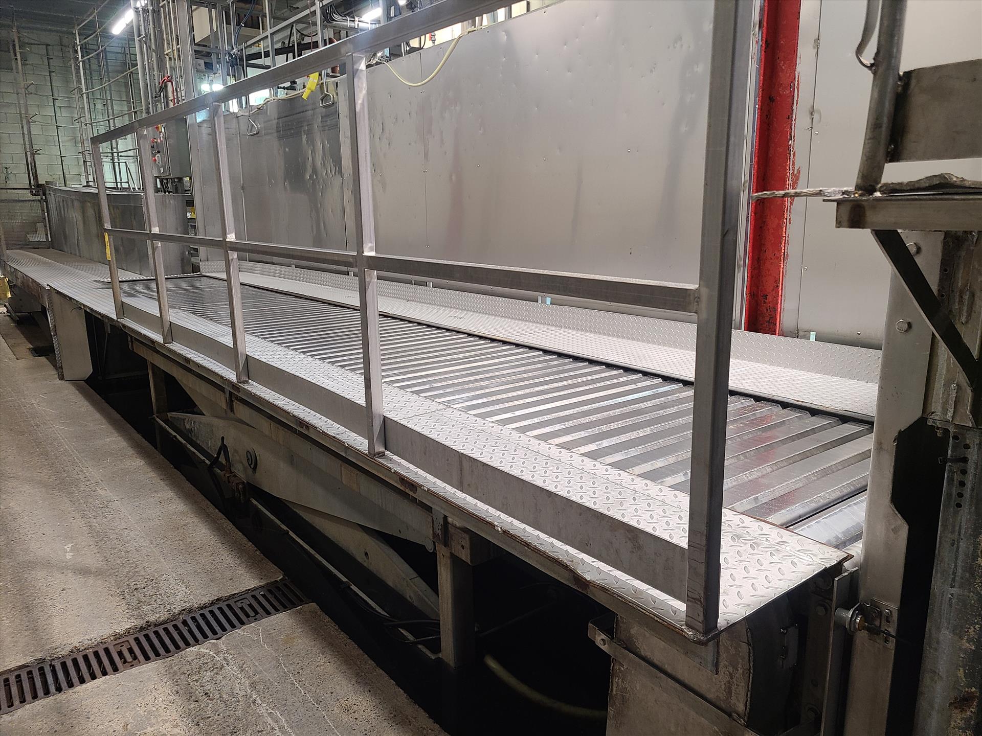 Stork tray conveyor/scissor lift, stainless steel, approx. 36 in. x 24 ft., power [Loc. Live Rec./Kill]