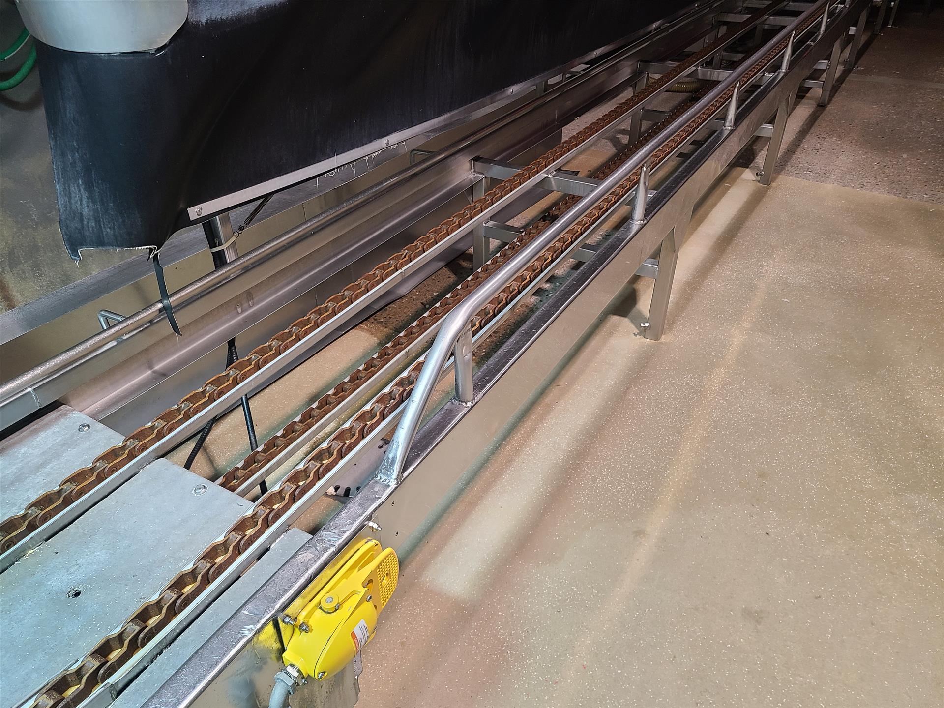 tray chain conveyor, stainless steel, approx. 27 in. x 30 ft., power [Loc. Live Rec./Kill]