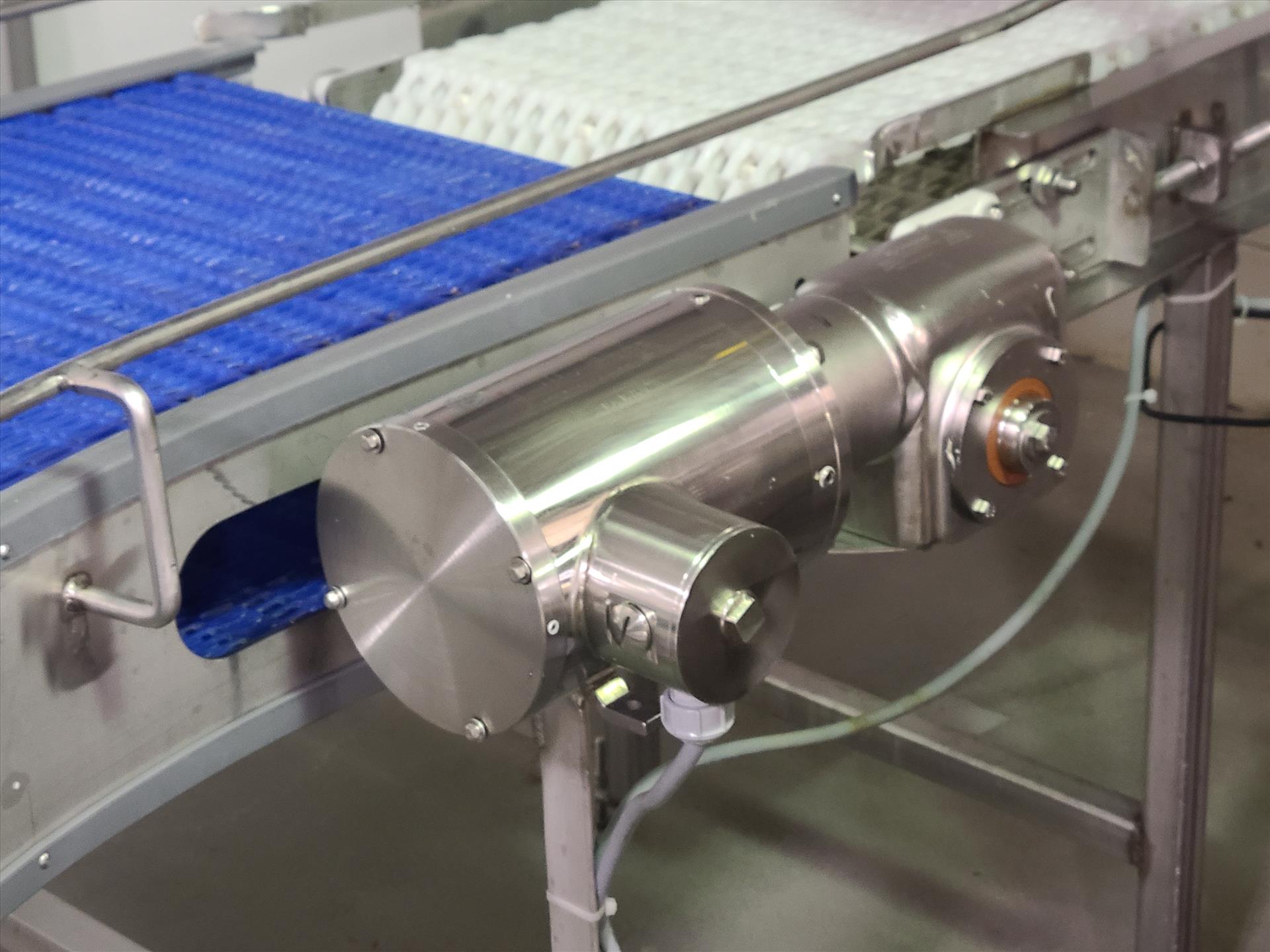 belt conveyor, approx. 22 in. x 8 ft., power, 90 deg., stainless steel, 0.75 hp washdown motor [Loc. Whole Bird]