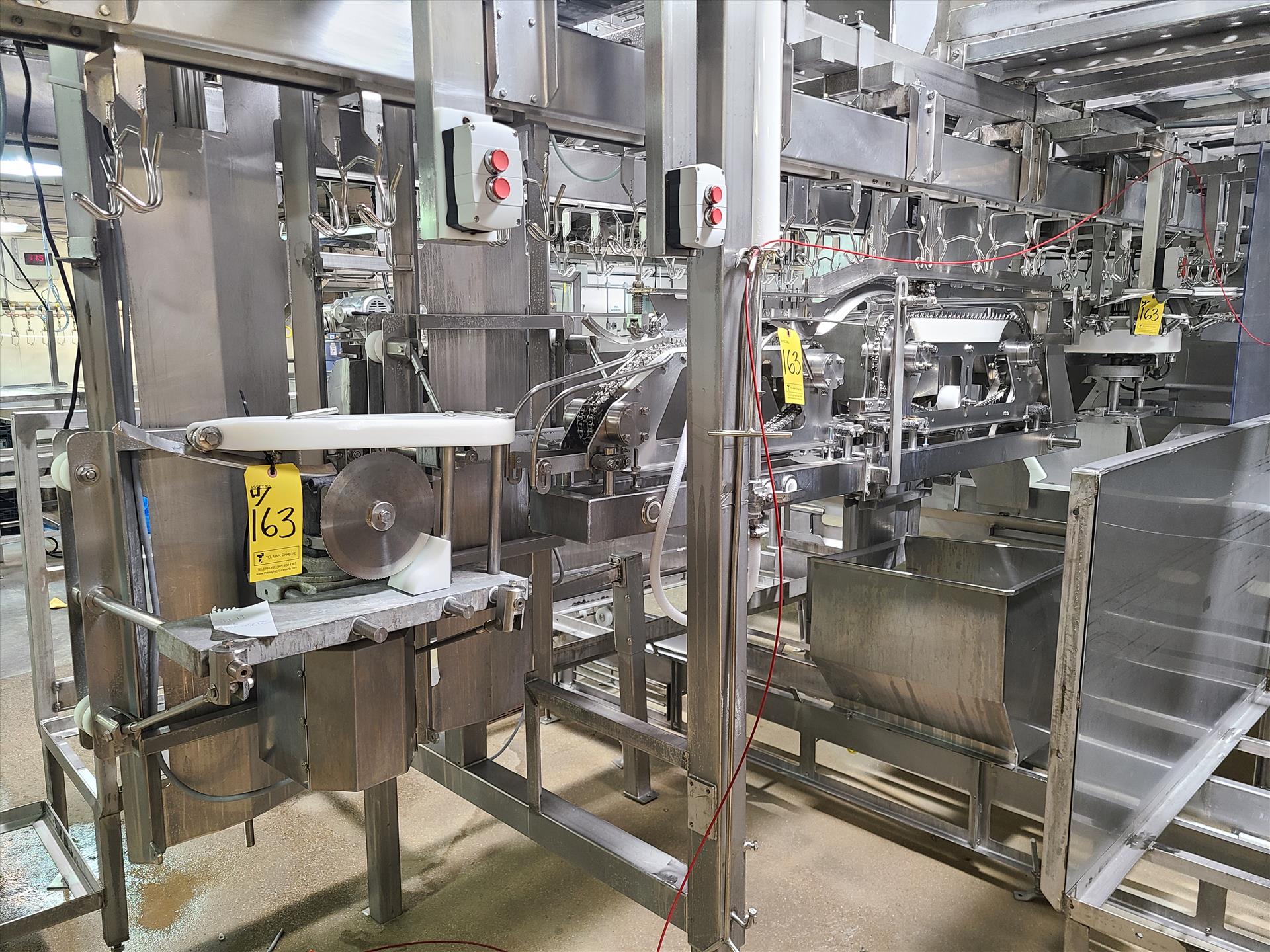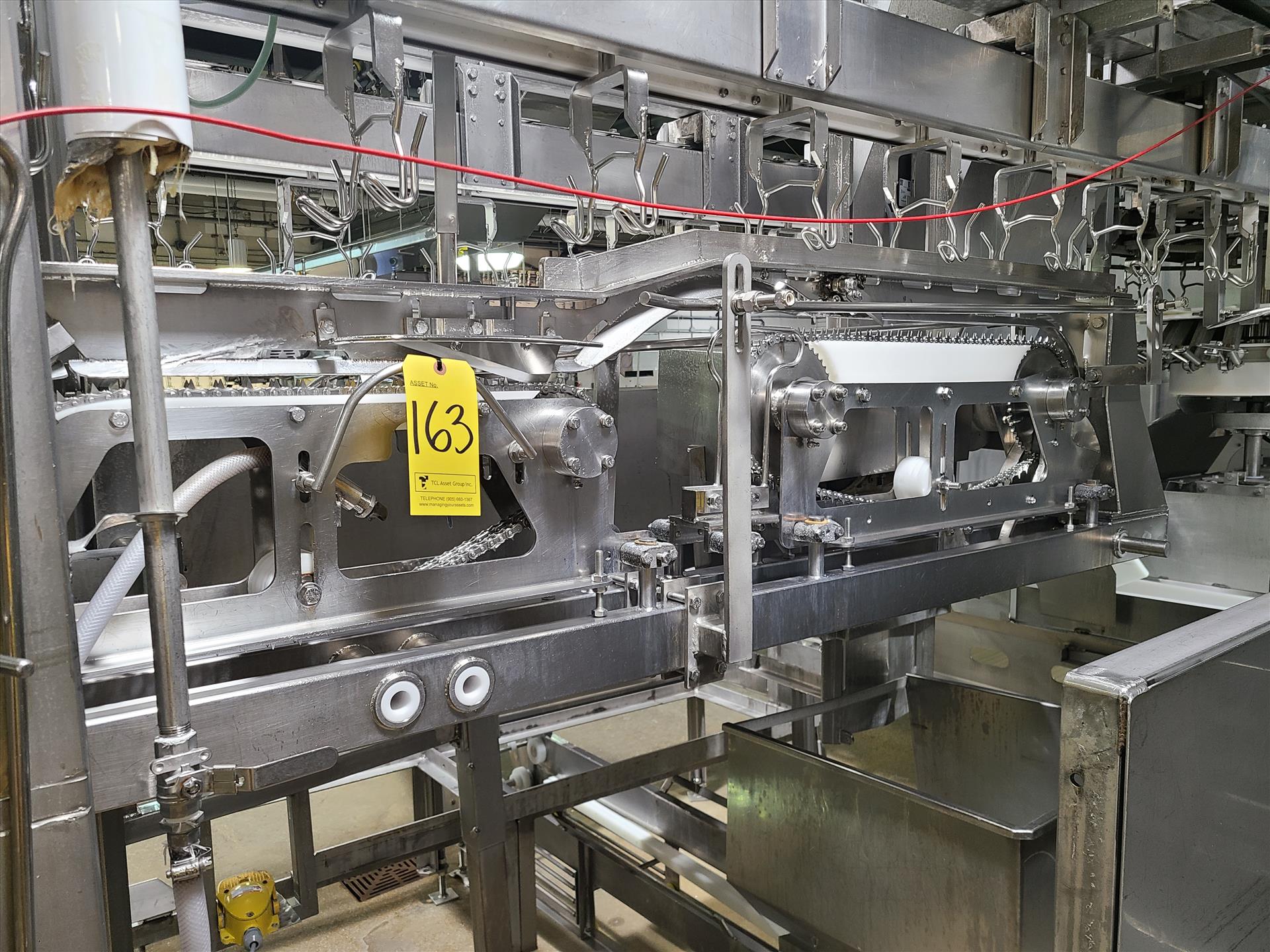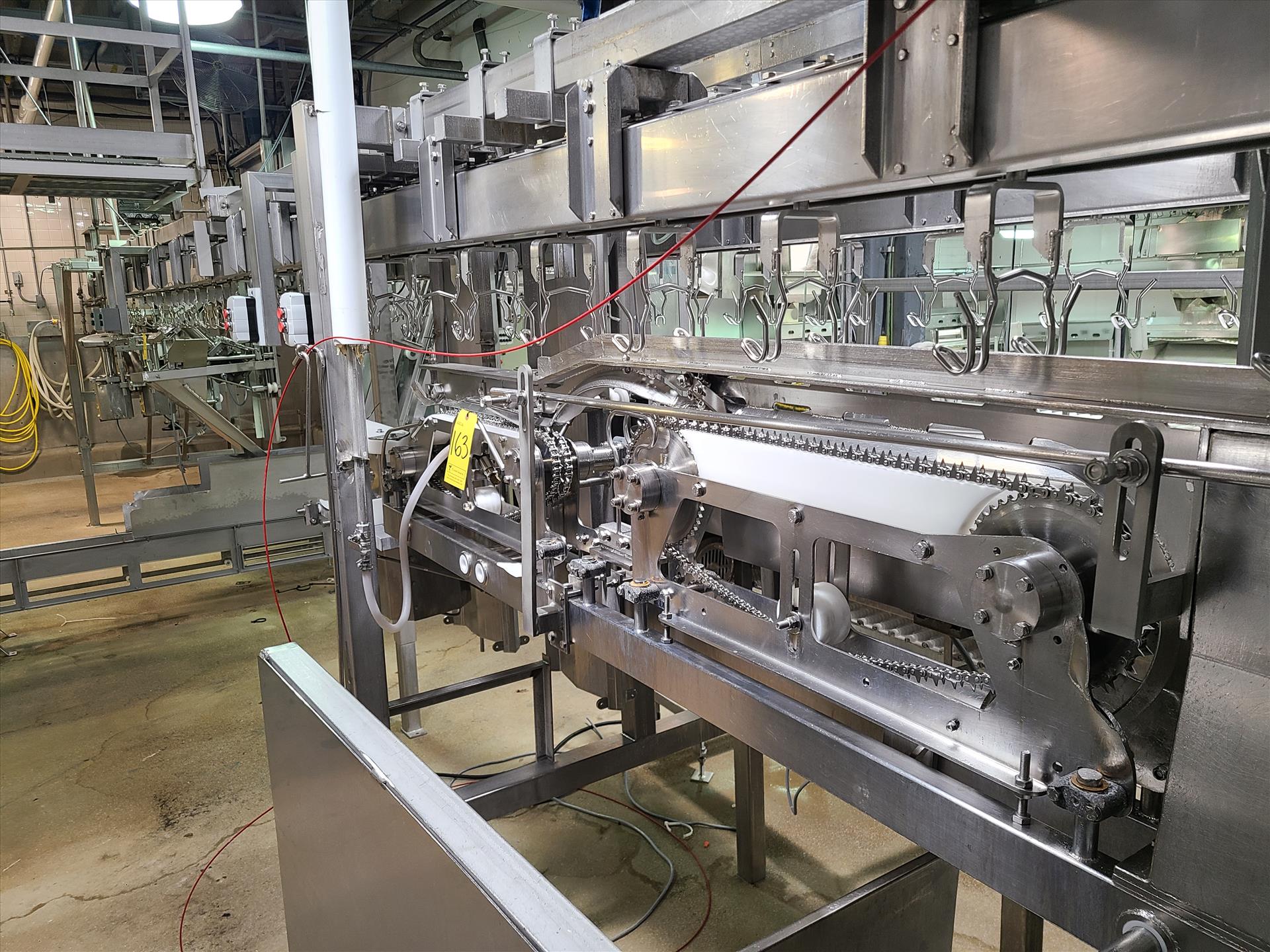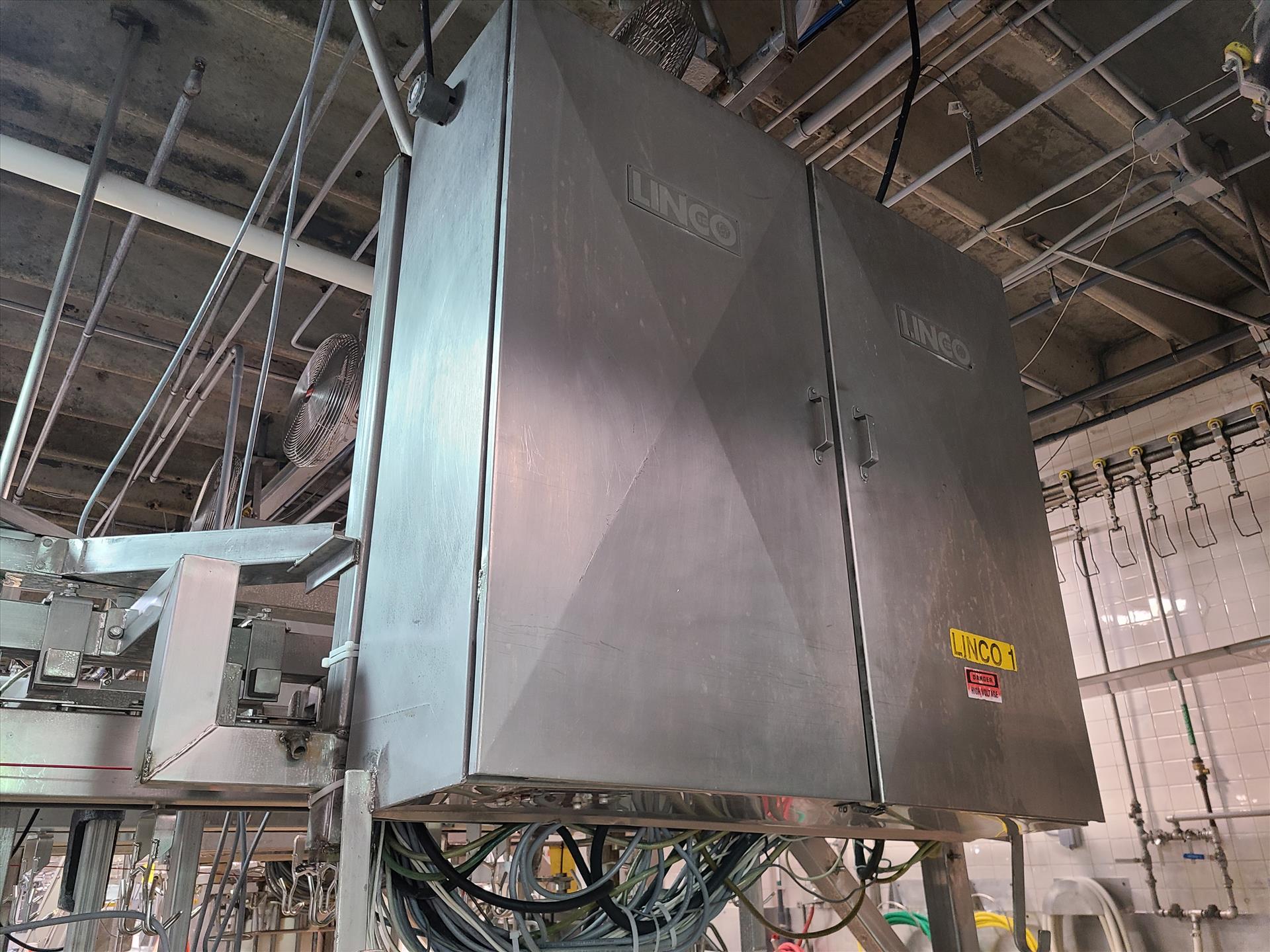 Linco cut-up Line 1, stainless steel, overhead conveyor w/ stainless steel shackles at 12 in., rehang station w/ belt conveyor, approx. 12 in. x 112 in. w/ split-leg quarters module, back-cutter module, breast cap module [Loc. Cut-Up, Line 1]