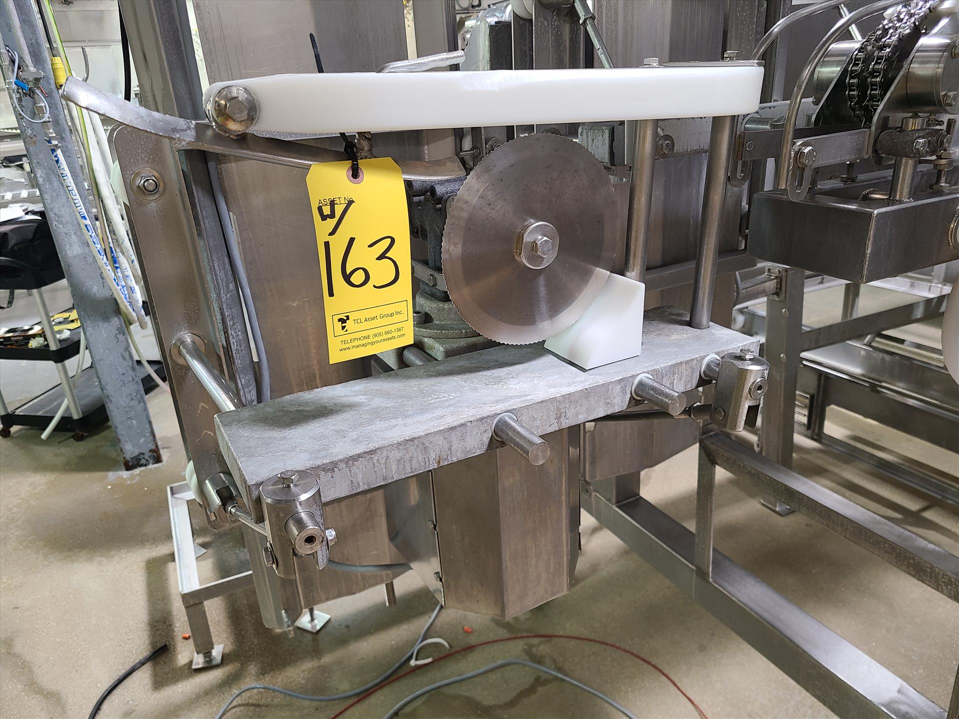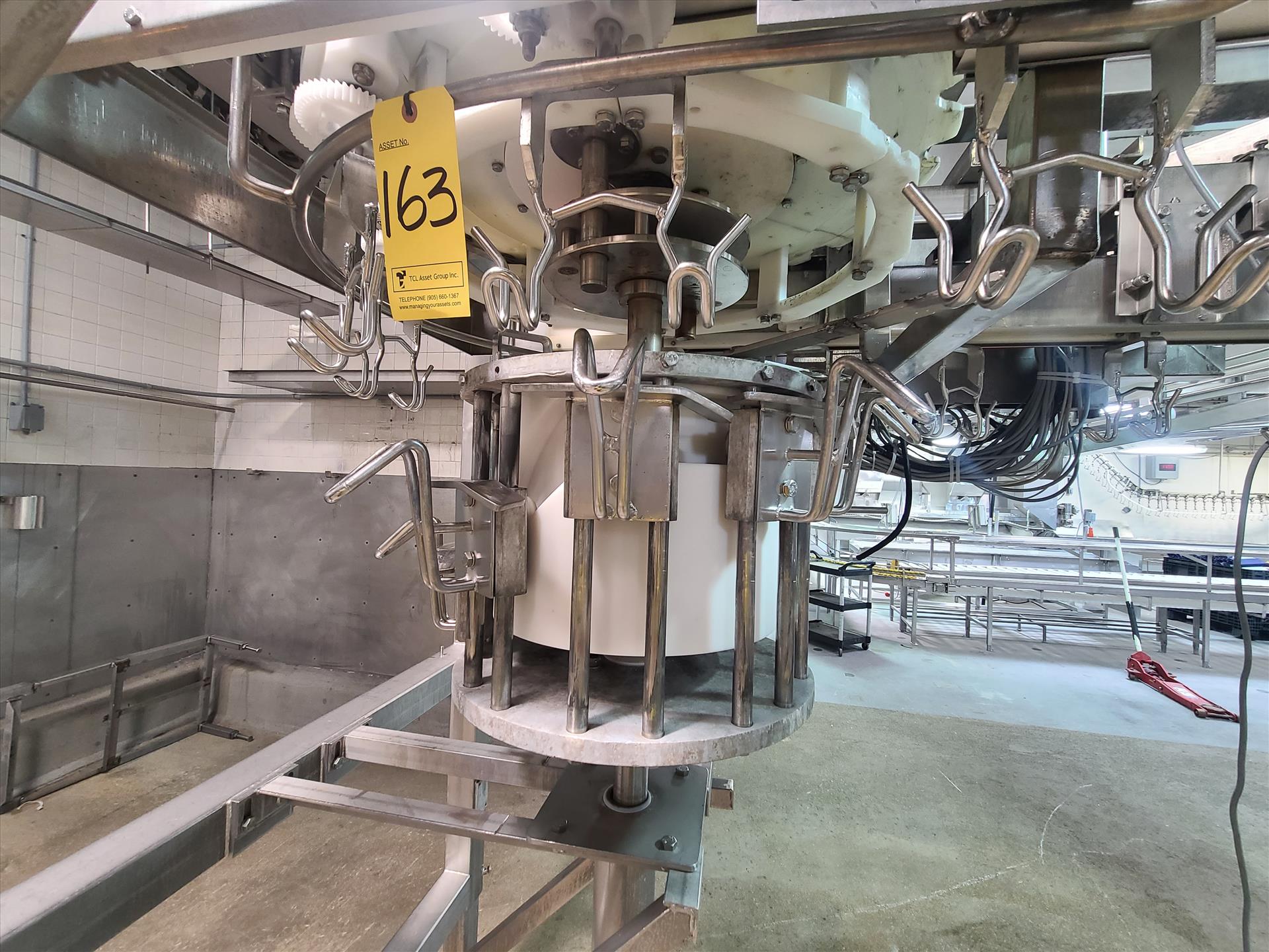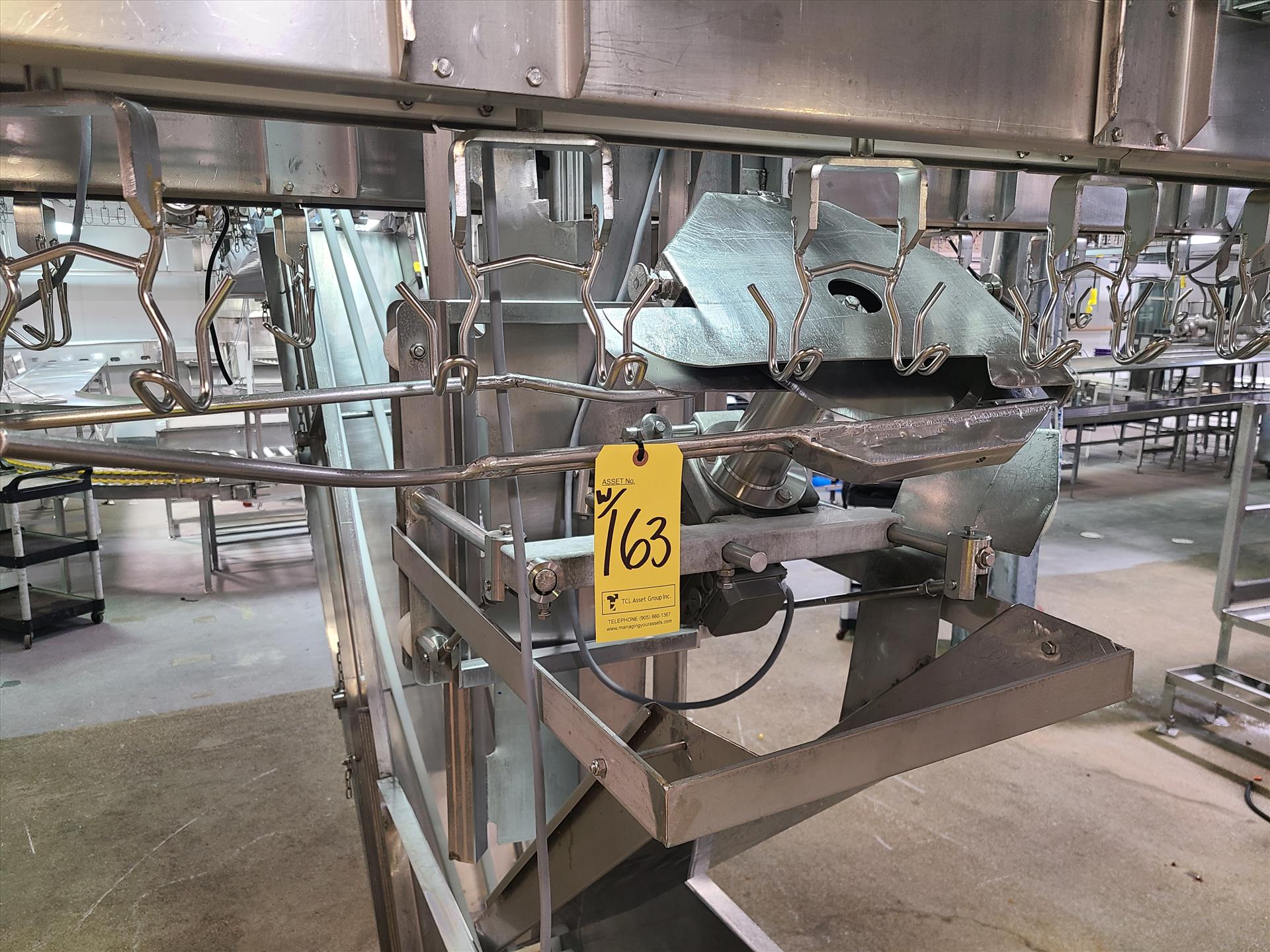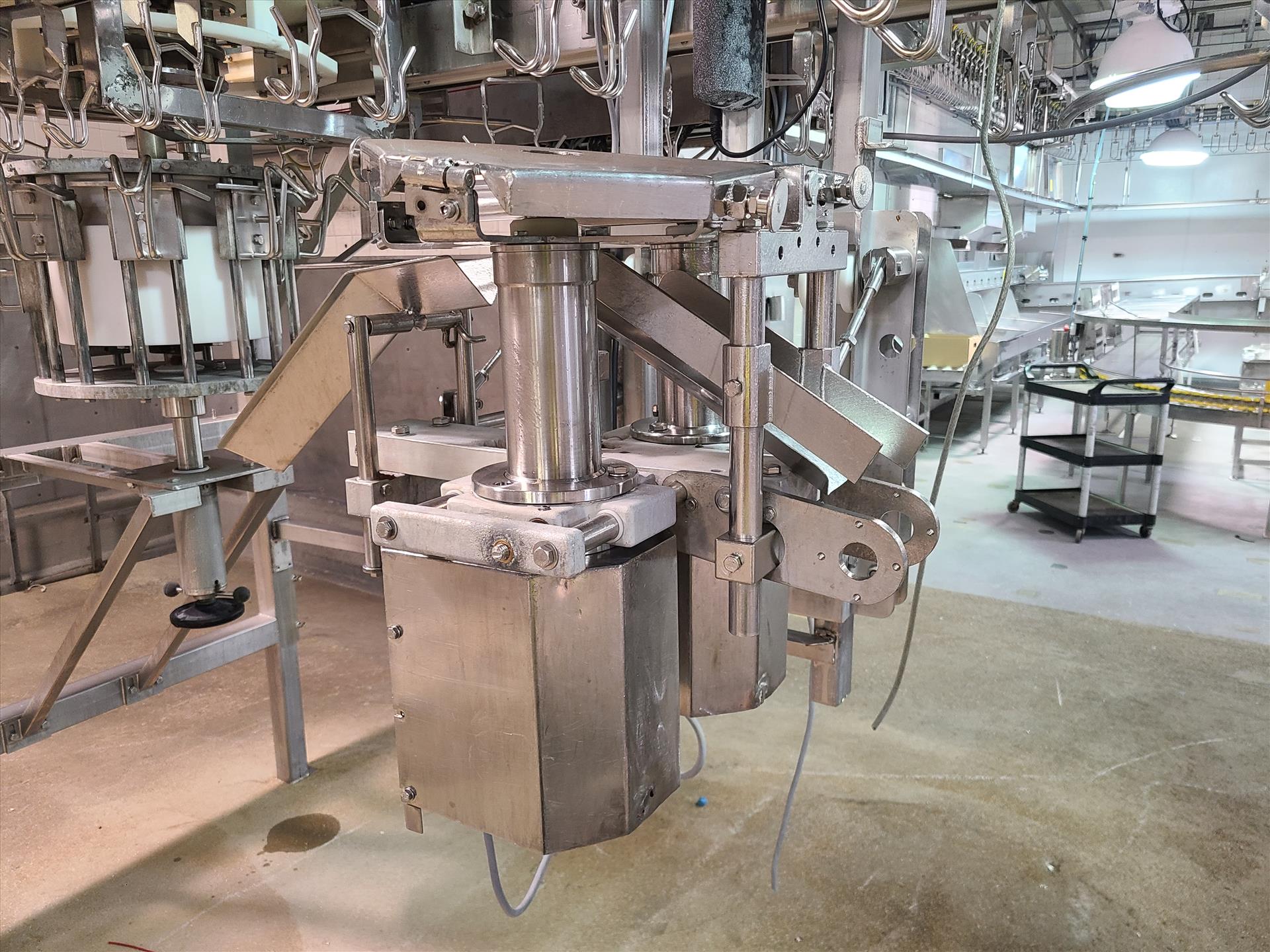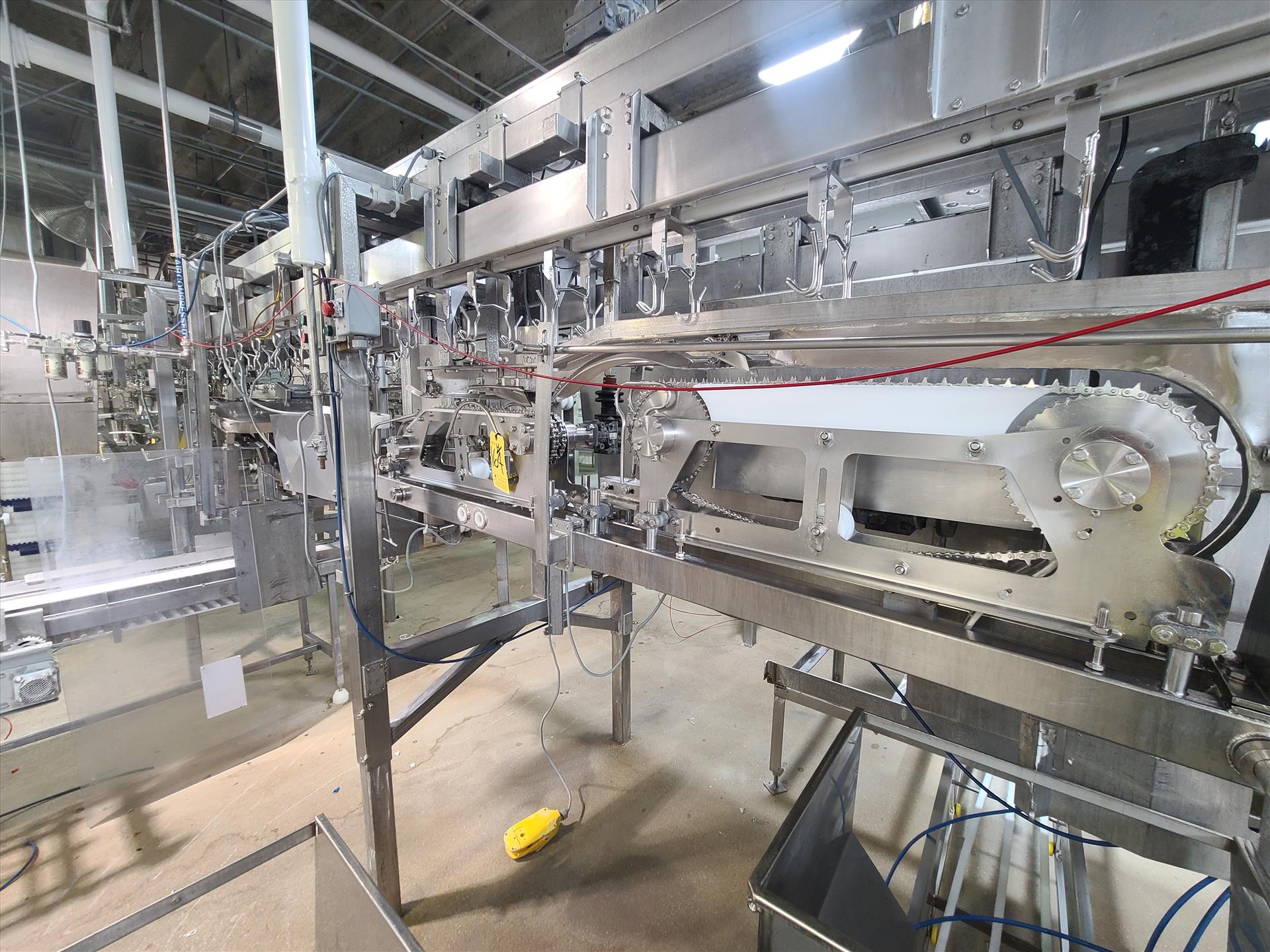 Linco cut-up Line 1, stainless steel, overhead conveyor w/ stainless steel shackles at 12 in., rehang station w/ belt conveyor, approx. 12 in. x 112 in. w/ split-leg quarters module, back-cutter module, breast cap module [Loc. Cut-Up, Line 1]