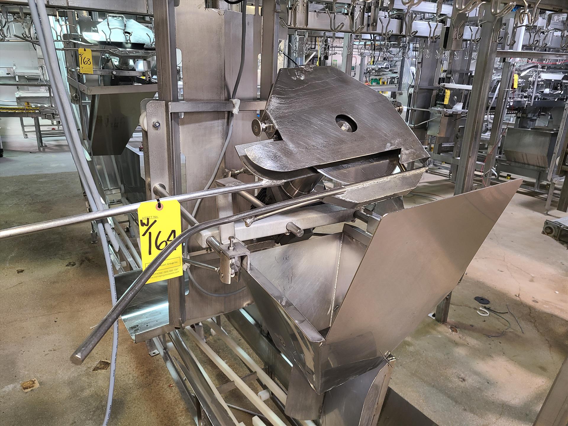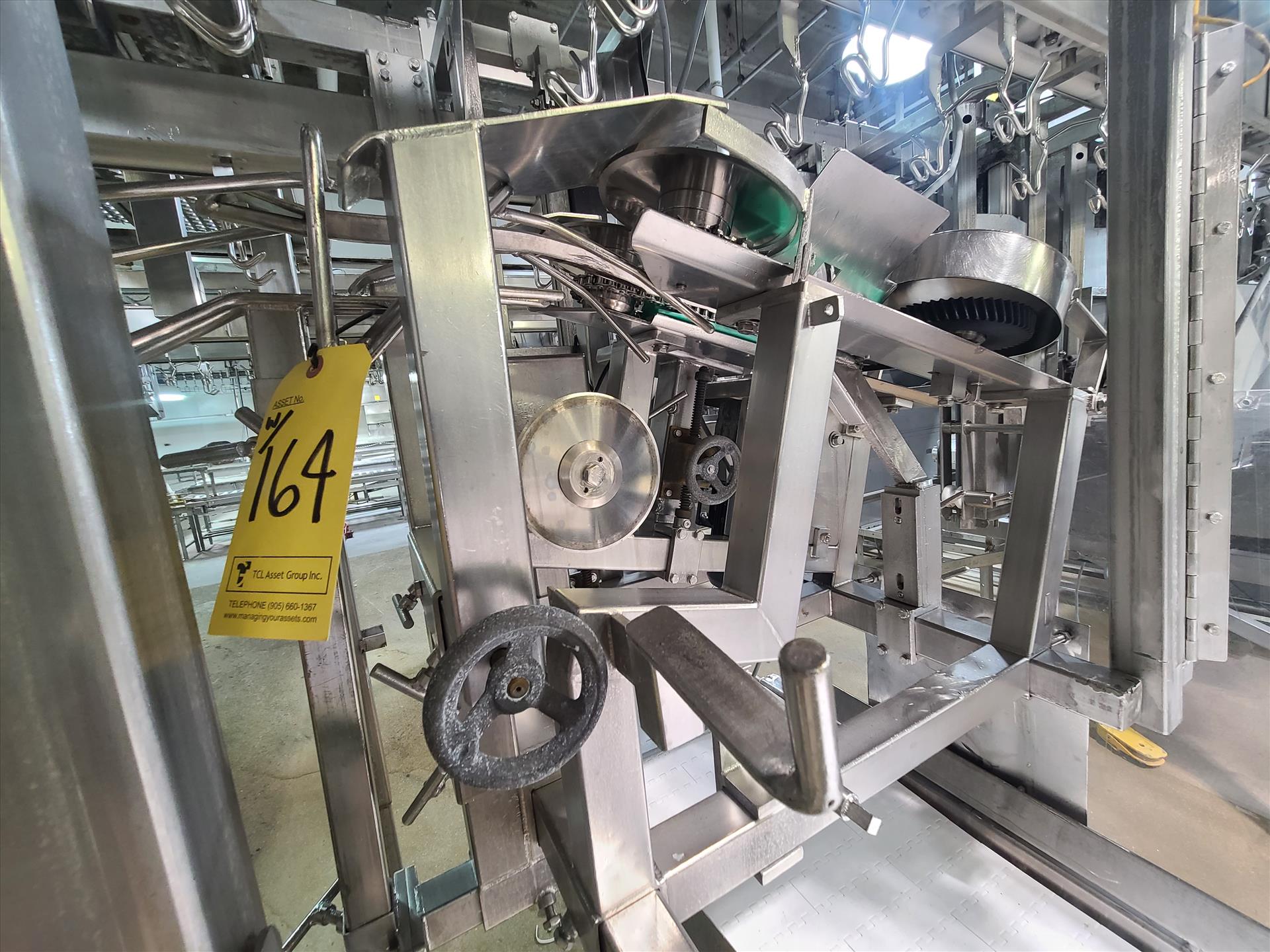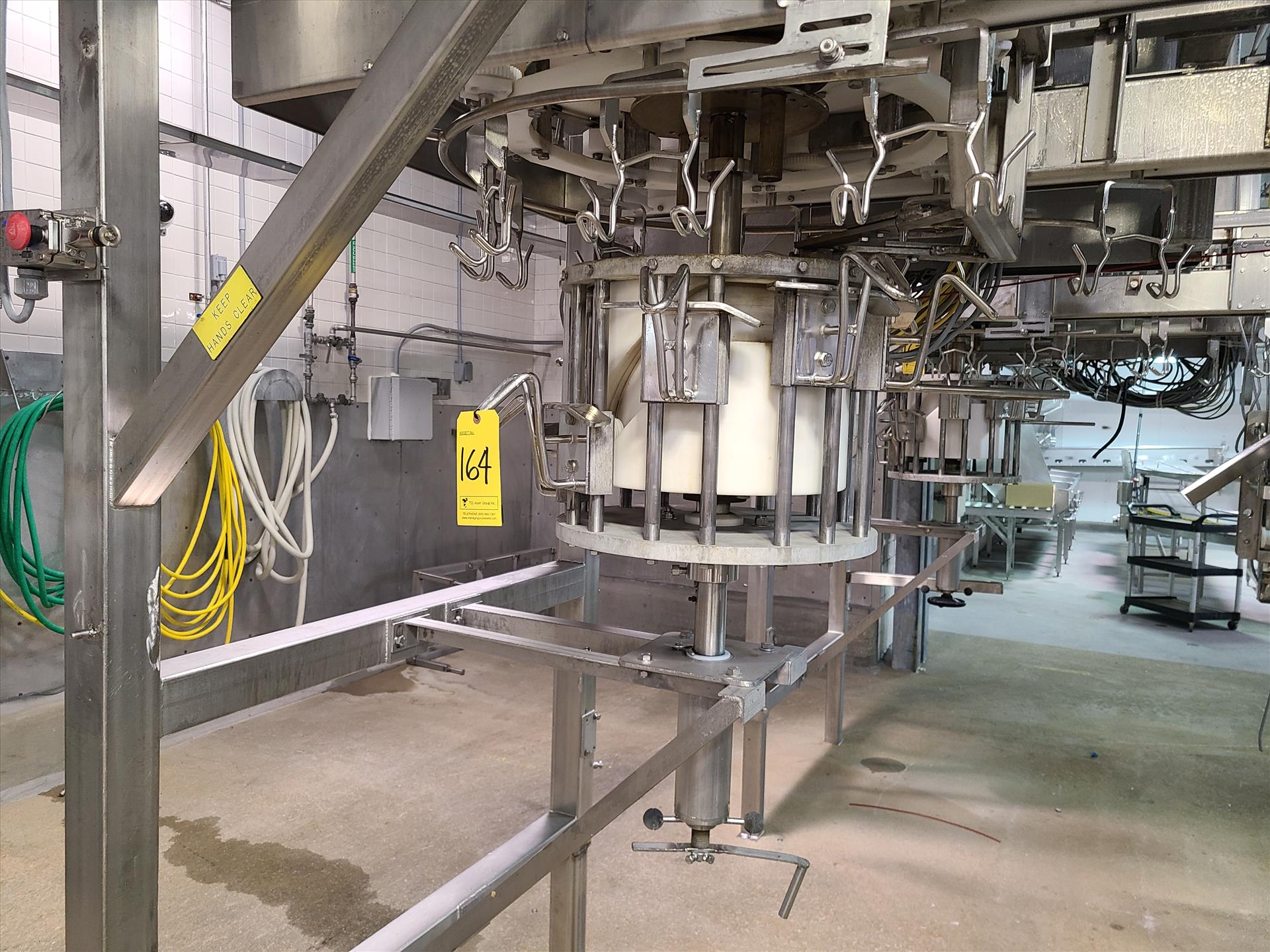Linco cut-up Line 2, stainless steel, overhead conveyor w/ stainless steel shackles at 12 in., rehang station w/ belt conveyor, approx. 12 in. x 112 in. w/ split-leg quarters module, back-cutter module, breast cap module and slit-breast module [Loc. Cut-Up, Line 2]