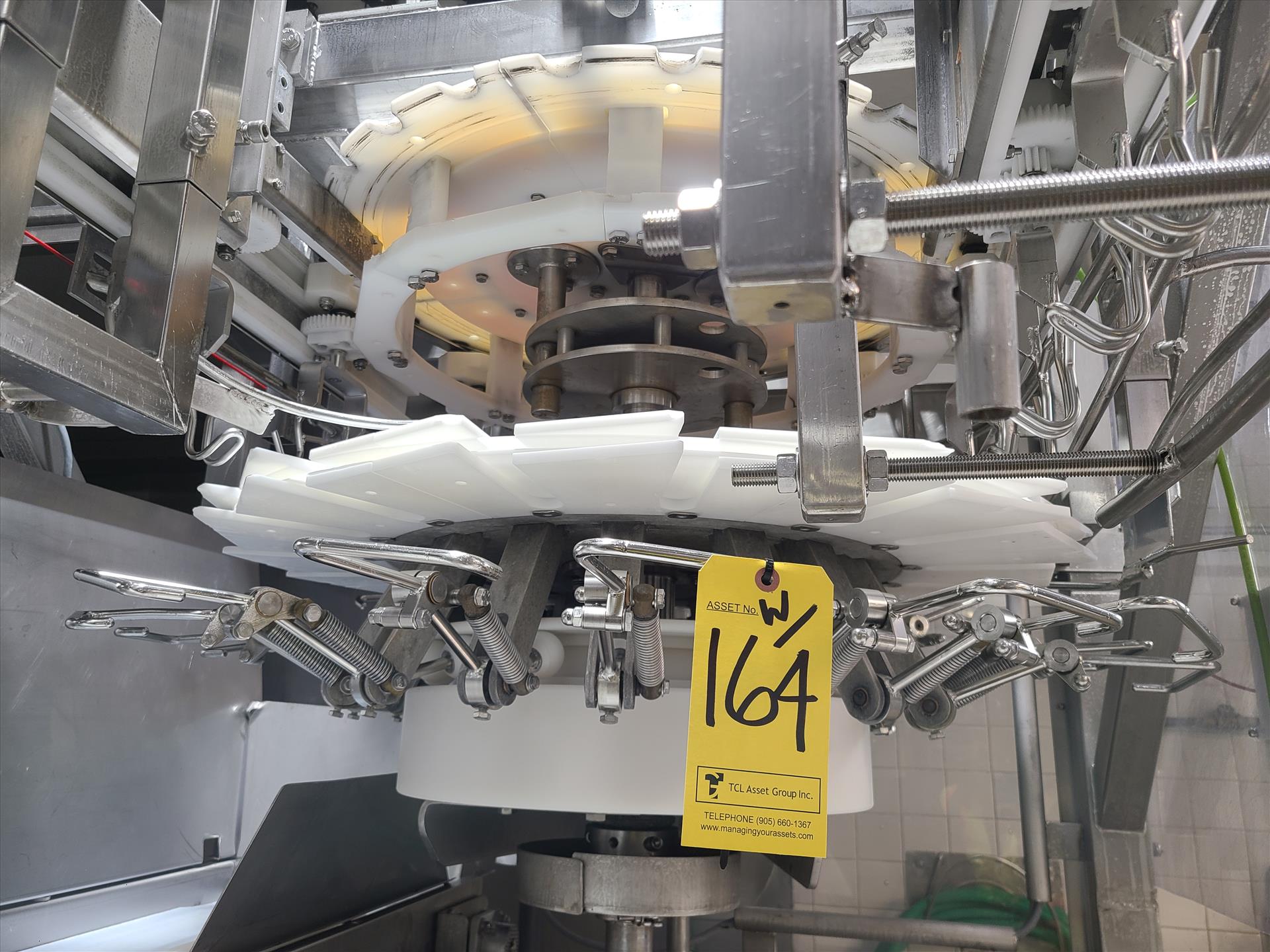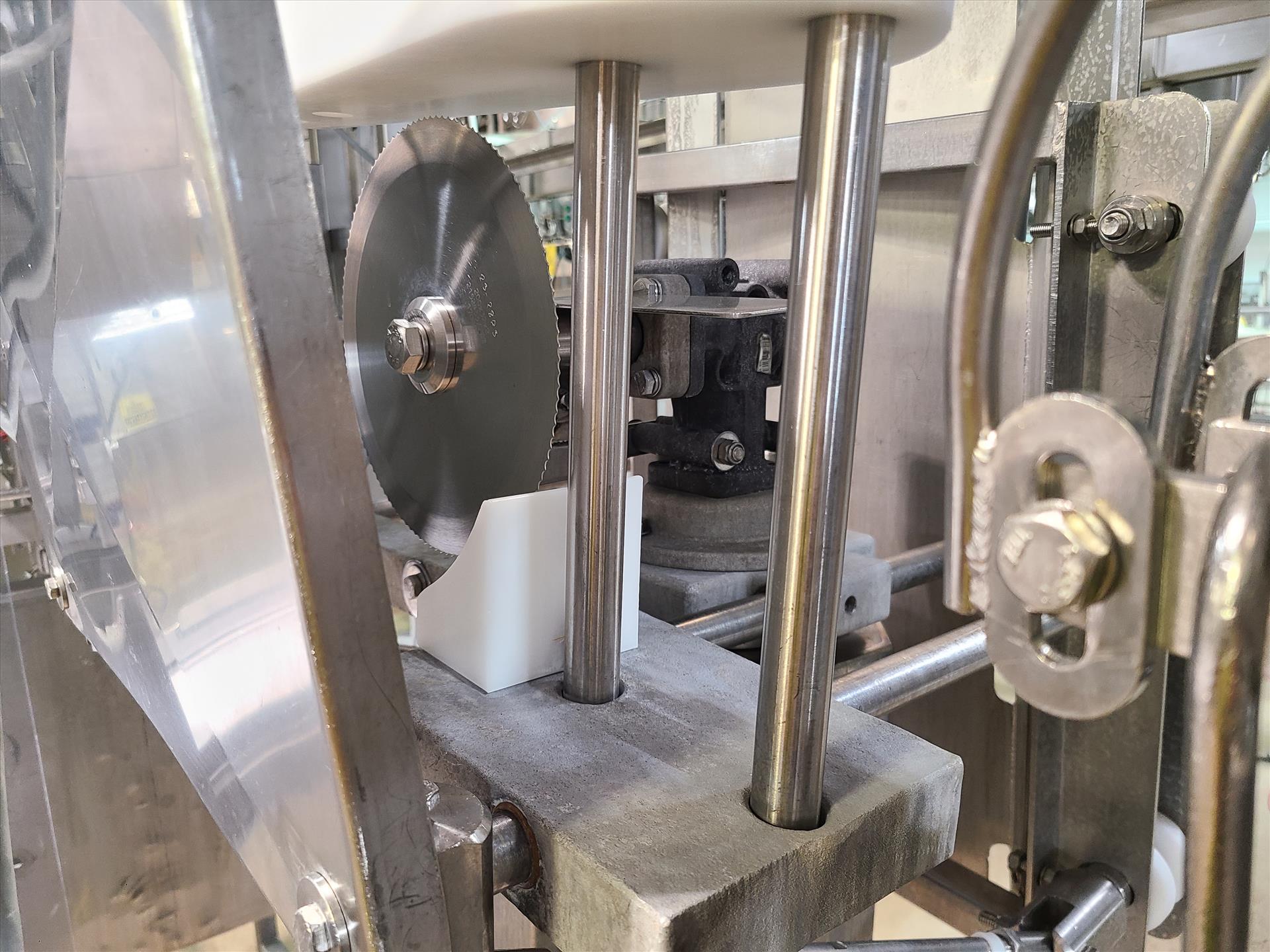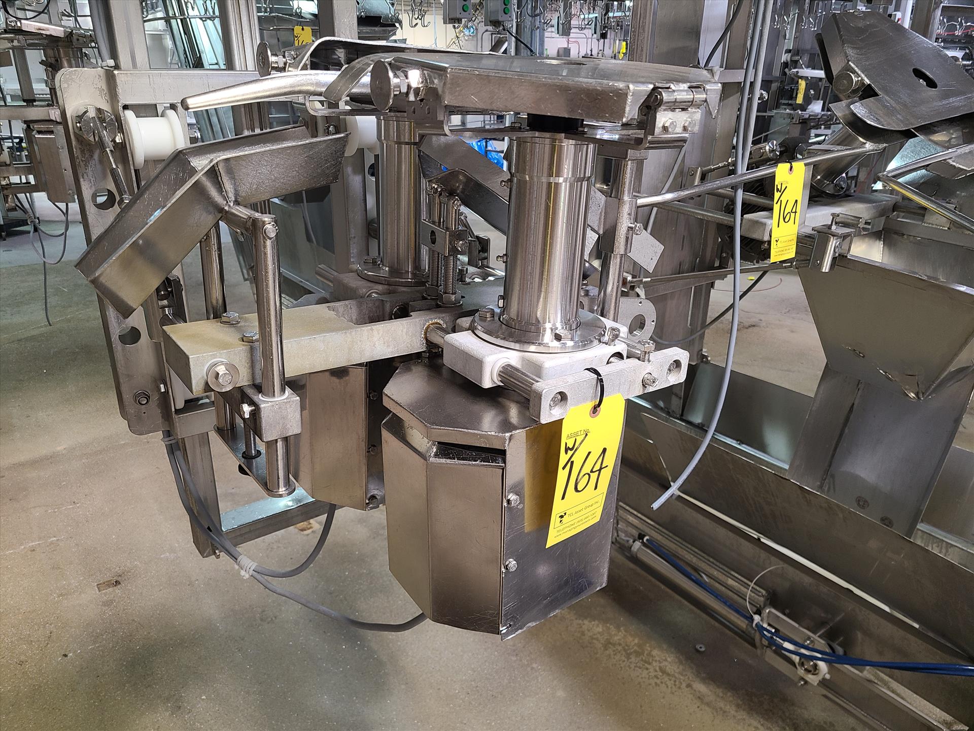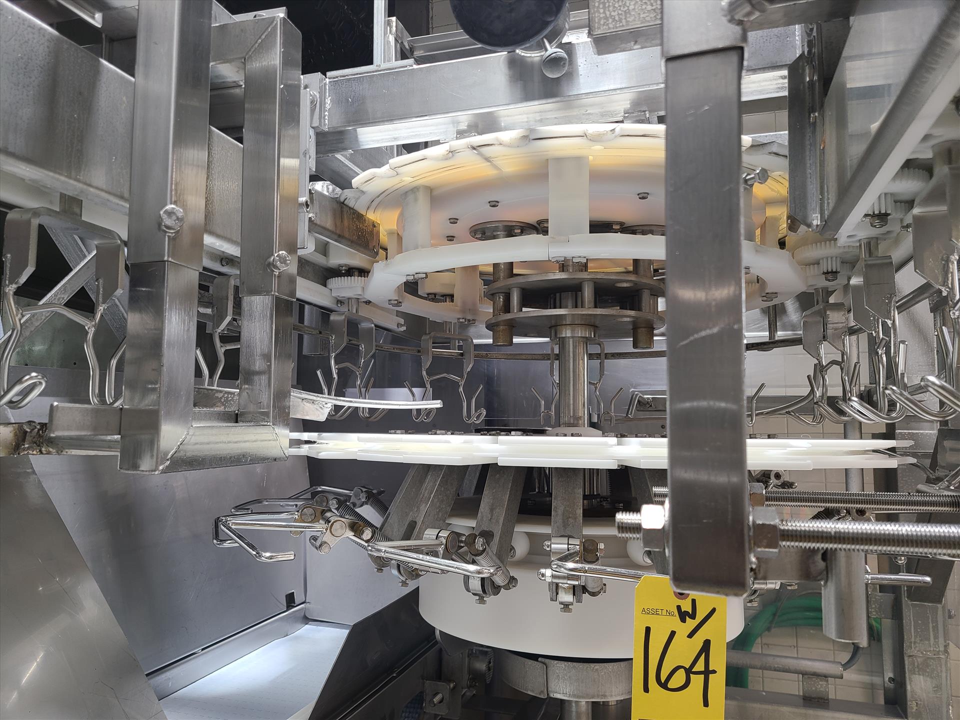 Linco cut-up Line 2, stainless steel, overhead conveyor w/ stainless steel shackles at 12 in., rehang station w/ belt conveyor, approx. 12 in. x 112 in. w/ split-leg quarters module, back-cutter module, breast cap module and slit-breast module [Loc. Cut-Up, Line 2]