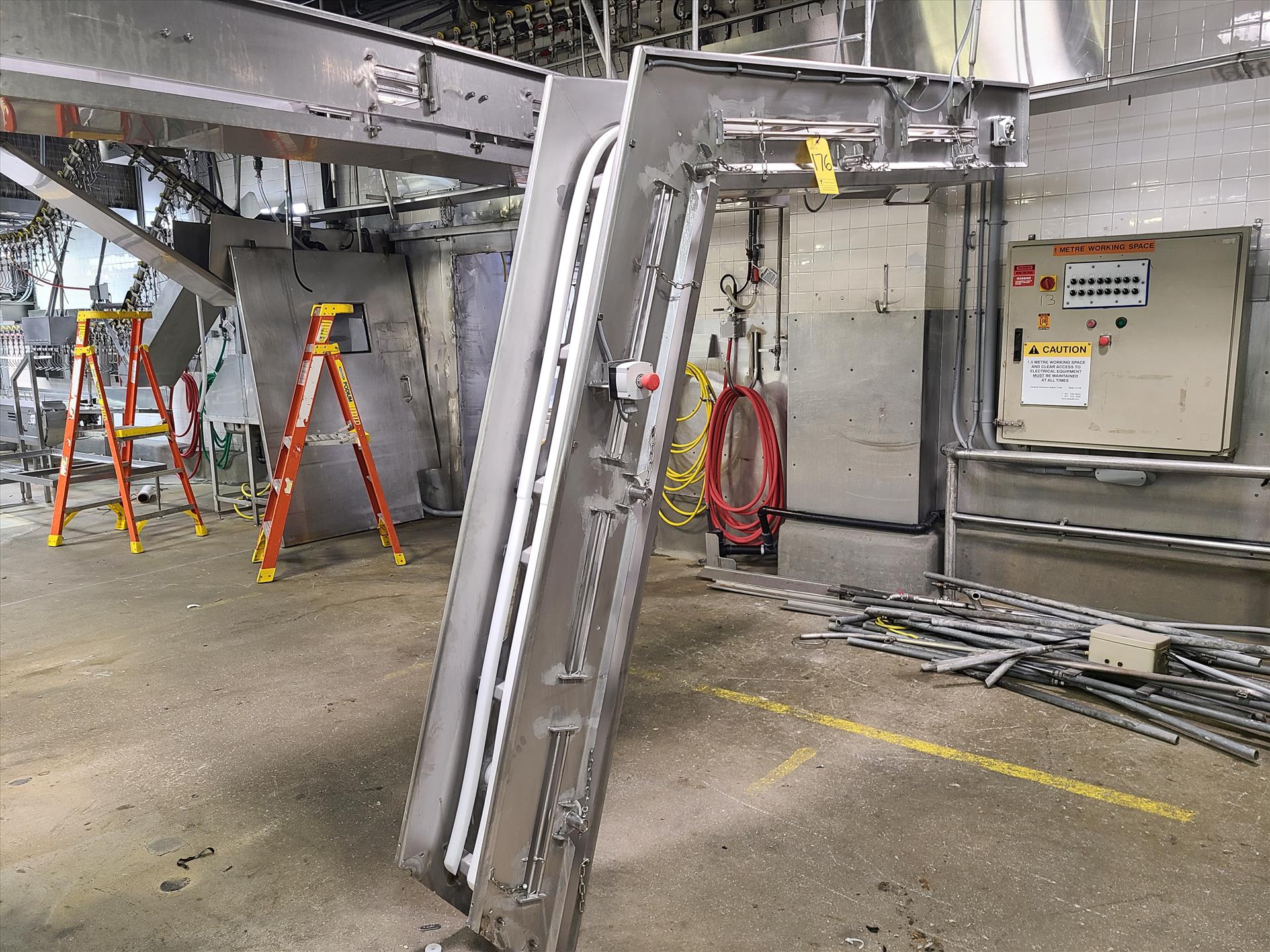 reject inclined fluted belt conveyor, approx. 12 in. x 26 ft. x 86 in. high, 0.75 hp wash-down motor, stainless steel [Loc. Cut-Up]