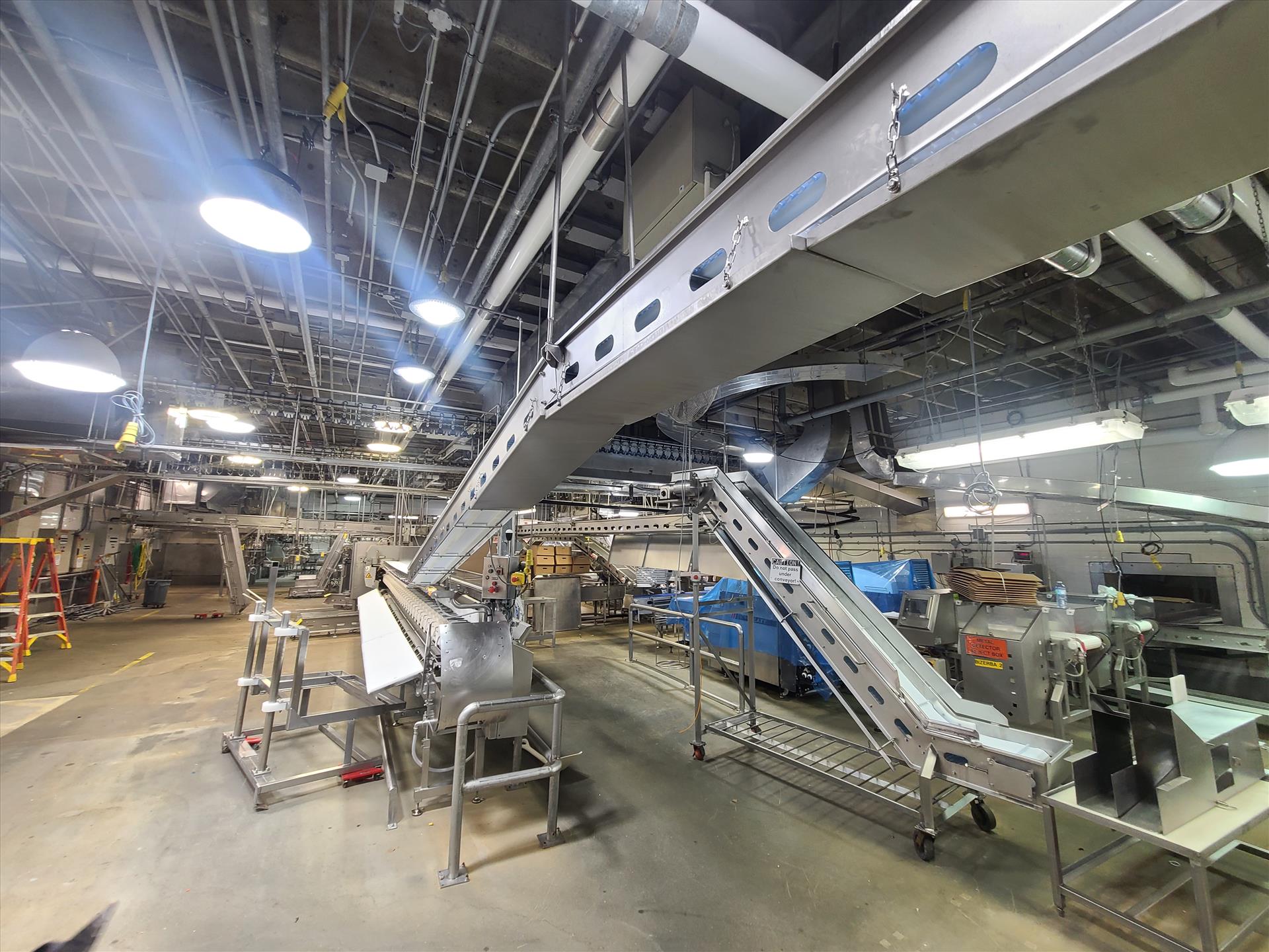 outfeed suspended belt conveyor, approx. 10 in. x 42 ft., power, stainless steel [Loc. Cut-Up]