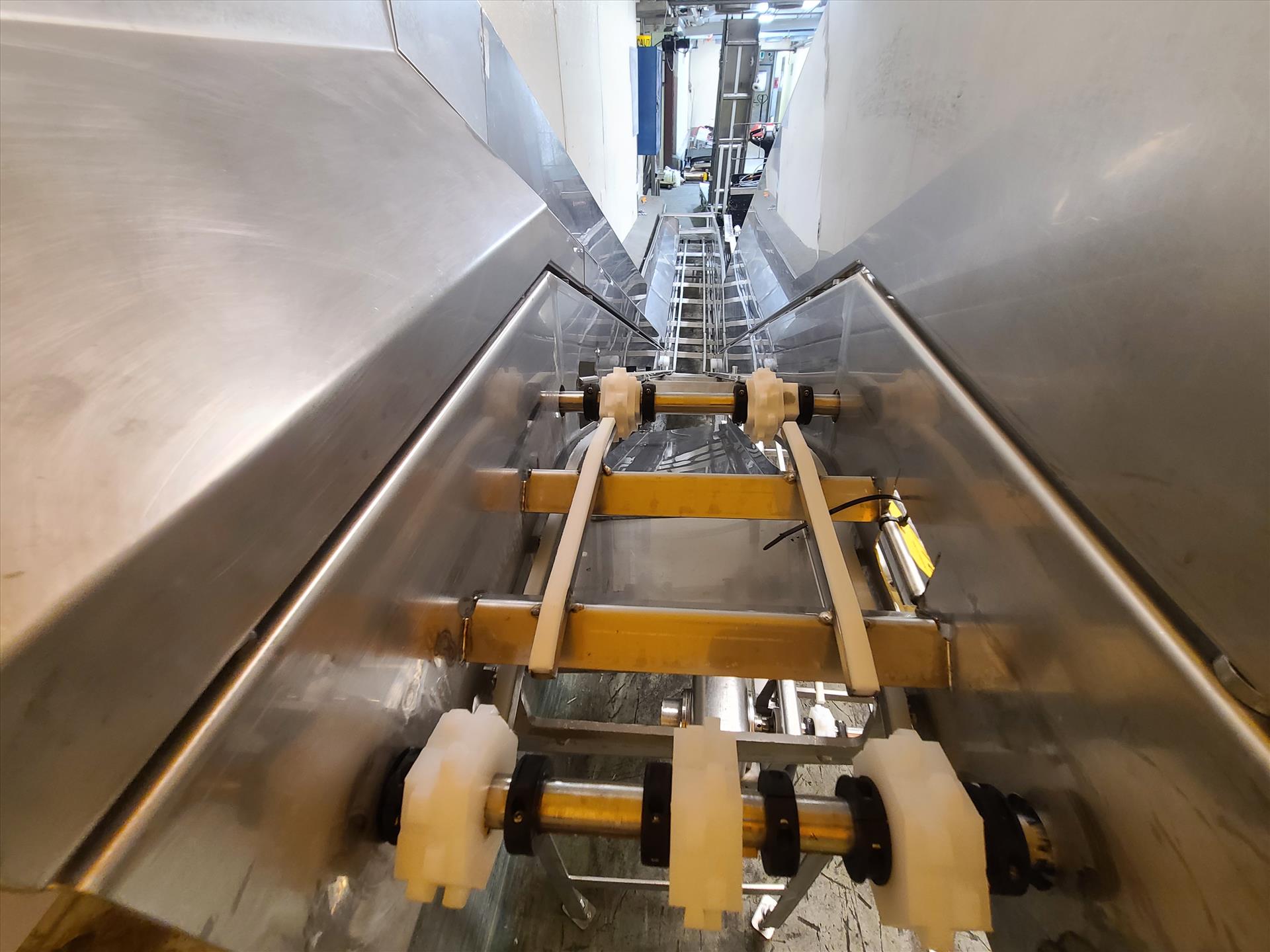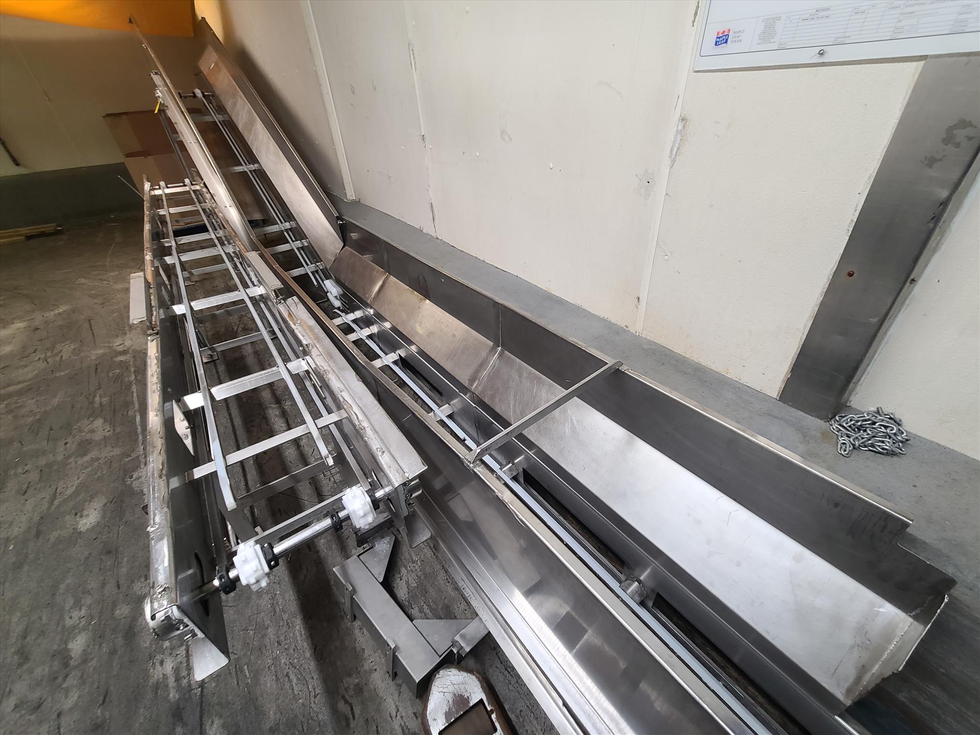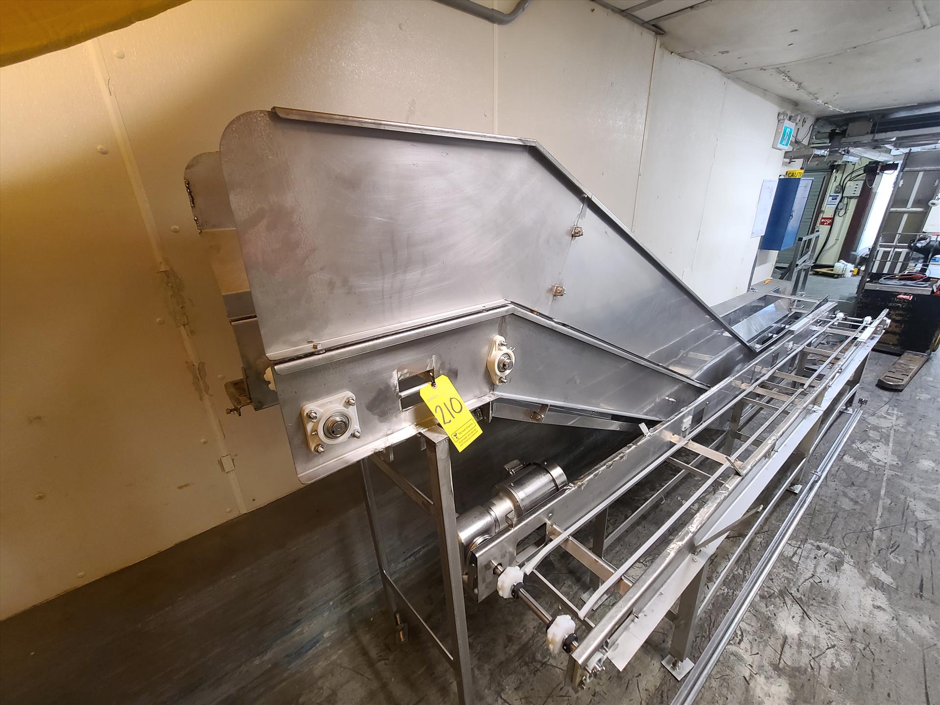 infeed inclined fluted belt conveyor, approx. 12 in. x 20 ft. x 56 in. high, 2 hp wash-down motor, stainless steel [Loc. Cut-Up]