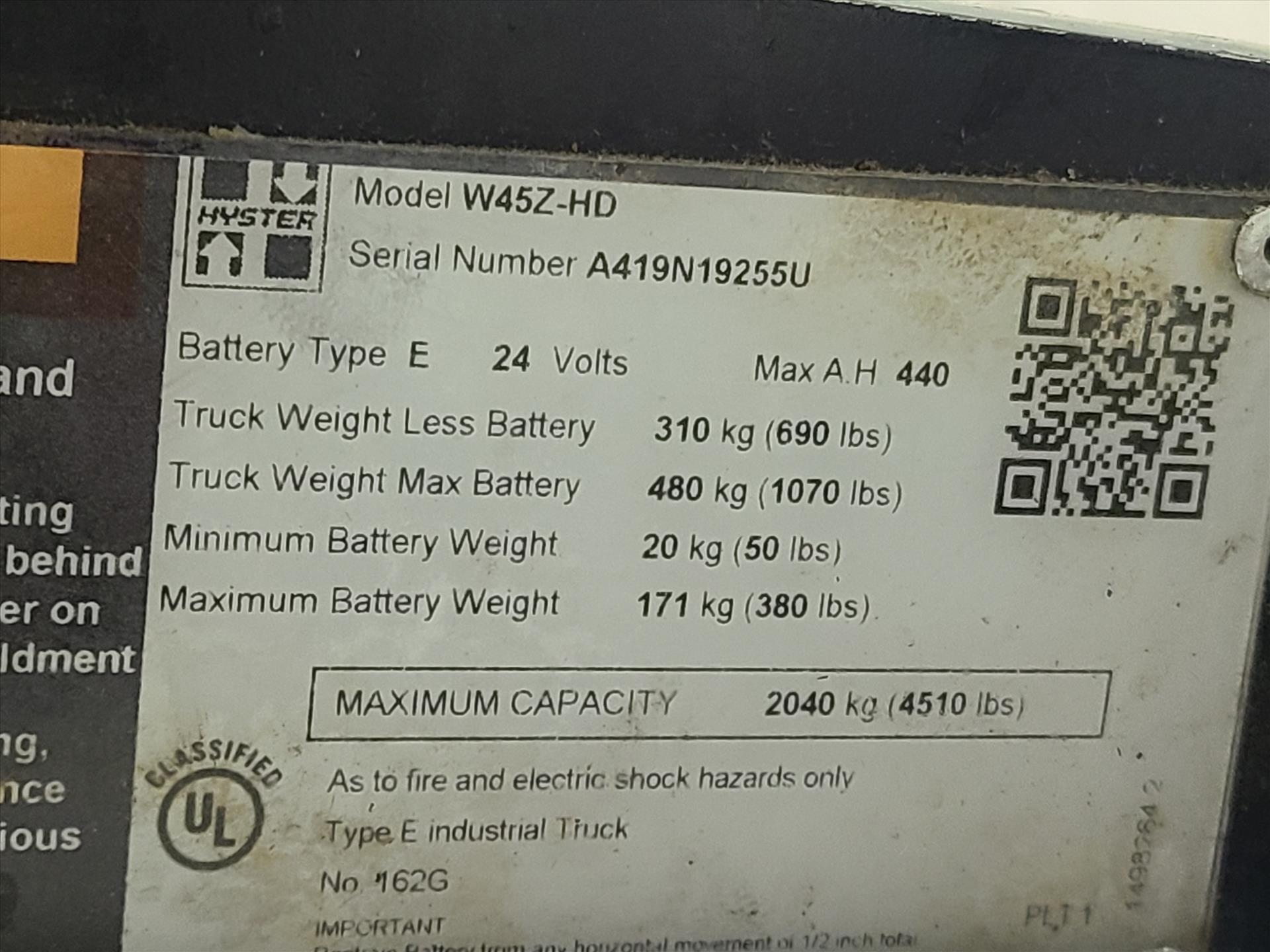 Hyster walk-behind pallet truck, mod. W452-HD, 4500 lbs. cap., integrated charger, I.D. 745 [Loc. Shipping]