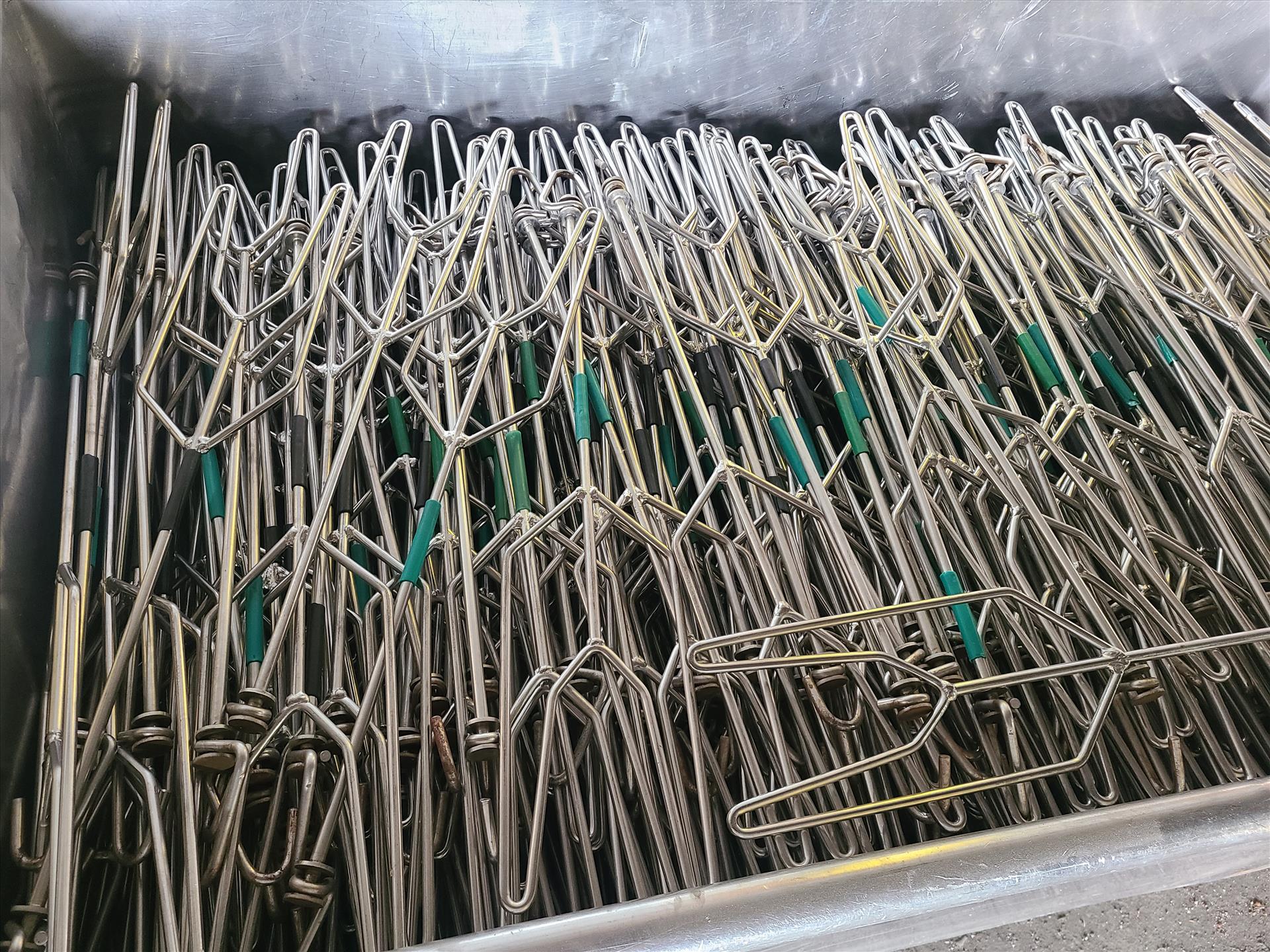 (approx. 860) Evisceration shackles, stainless steel, approx. 1780 lbs. (incl. tar weight) c/w stainless steel tub w/ casters [Loc. Truck Bay]