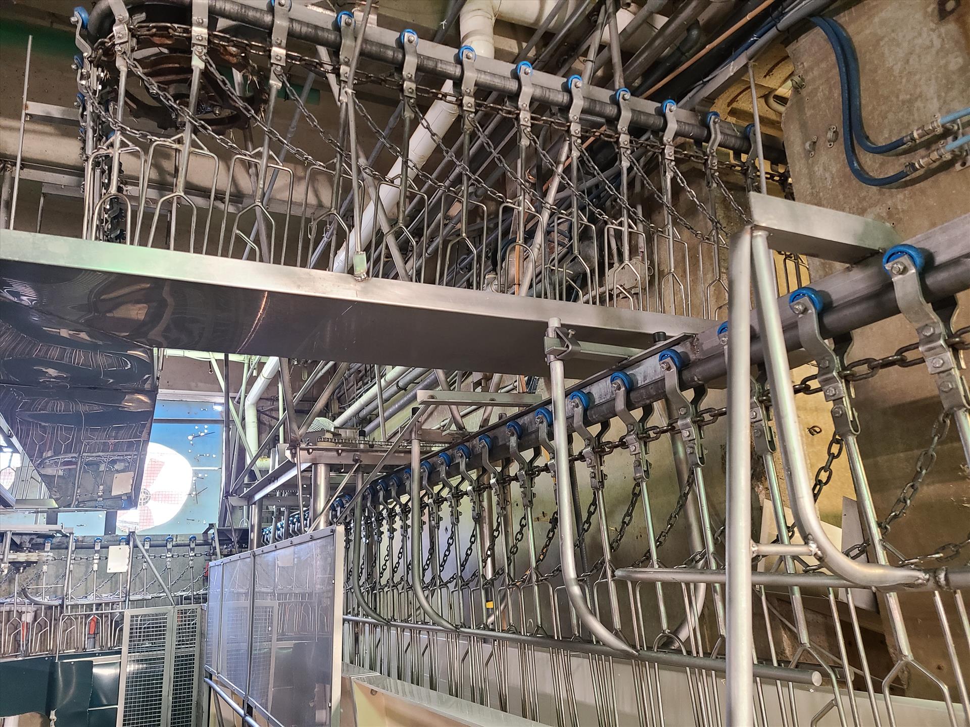 Live Receiving/Kill Line/De-Feathering overhead conveyor w/ stainless steel shackles at 6 in. approx. 340 ft. long [Kill Line]