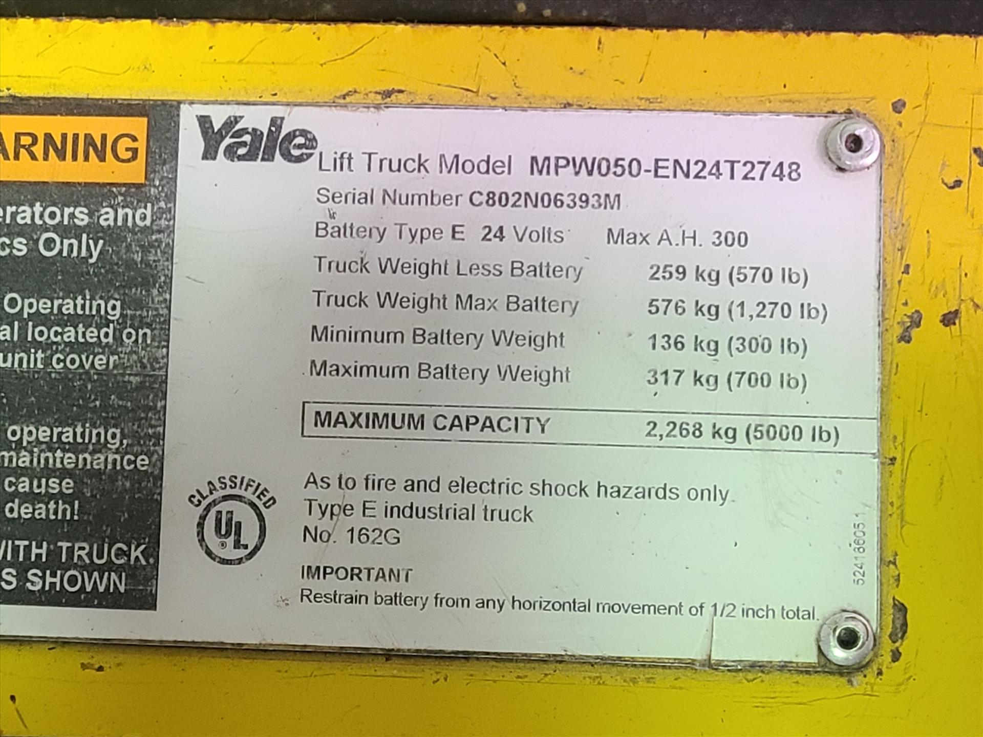 Yale walk-behind pallet truck, mod. MPW50-EN24T2748, ser. no. C802N06393M, 5000 lbs. cap.,24V electric [Shipping/Receiving]