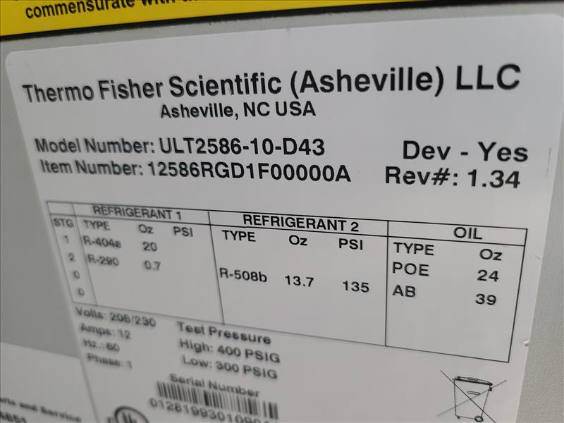 Thermo Scientific -80 ultra-low temp. freezer, mod. Revco Ultima Plus ULT2586-10-D43, ser. no. 0128199301090414