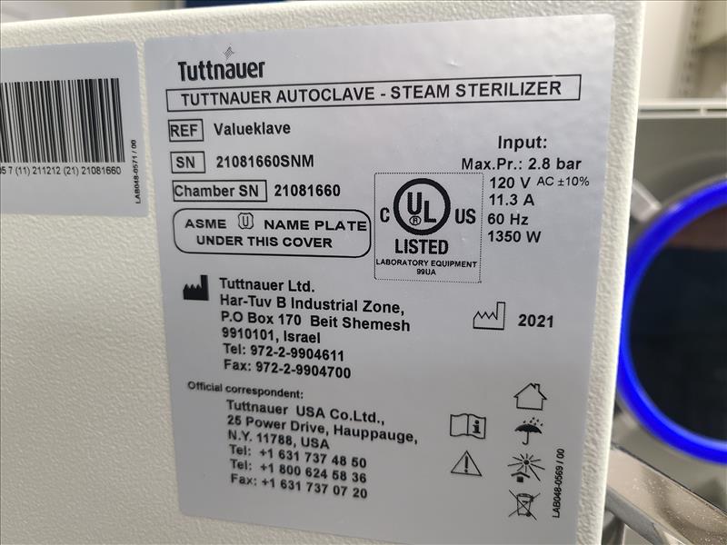 Tuttnauer tabletop autoclave steam sterilizer, mod. Valueklave, ser. no. 21081660SNM (2021)