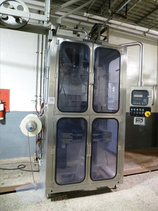 Cryovac On Pack-2000 s/s vertical form/fill/seal machine, mod. ONP-2000B, ser. no. 0075 c/w Waukesha s/s 5 h.p. positive displacement pump, mod. 130, ser. no. 155044, control panel mod. PE03S025, s/s fill hopper w/lid & roll of barrier pouch film, etc.