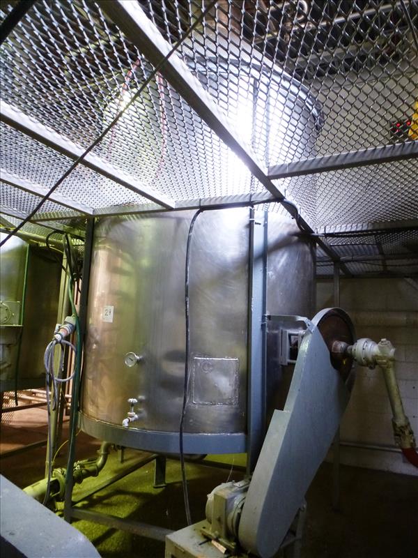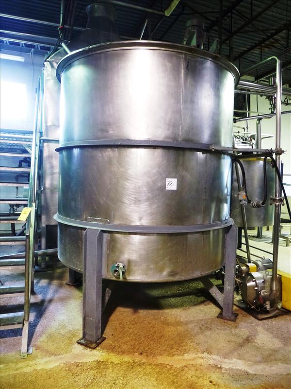 s/s rotary coil cooker tank, approx. 72" diam. x 96" high straight side c/w internal rotary steam coils, hooded top, steel stand & Tri-Clover s/s centrifugal pump, mod. SP328TD 00 A, ser. no. 5174. ITEM TO BE DISCONNECTED AT STACK. STACK TO REMAIN IN CEILING.