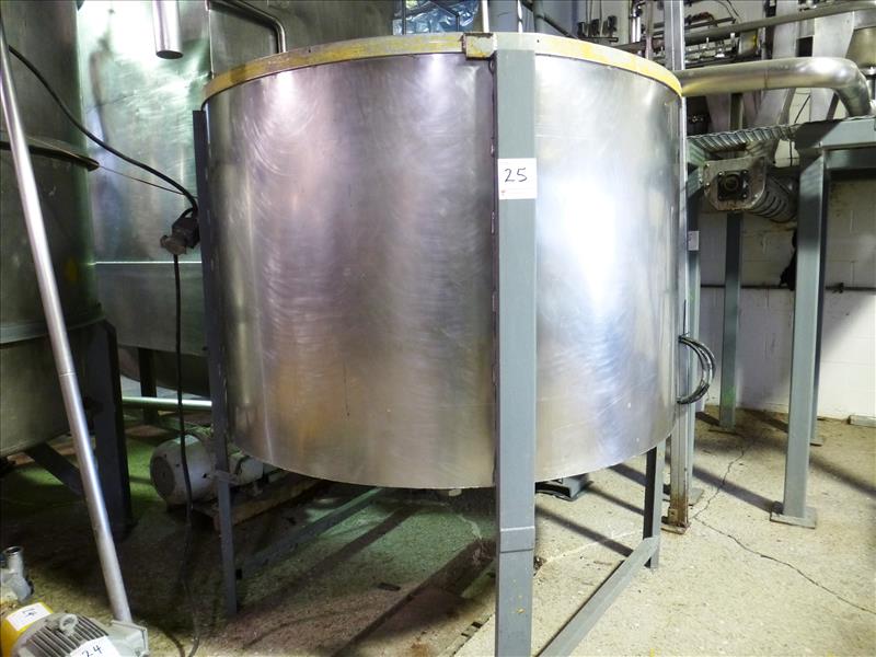 s/s open top holding tank, approx. 70" diam. x 48" high straight side c/w loose s/s lid & steel support stand
