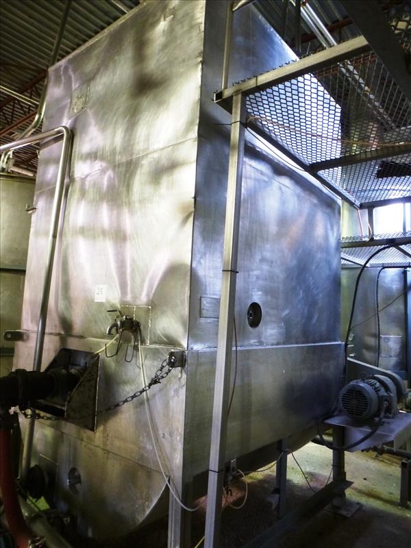 FranRica/Bishopric rectangular s/s rotary coil cooker tank, ser. no. AMCOI-RX-01-82 c/w internal rotary steam coils, hooded top, insulated jacket & s/s legs, approx. 70" x 78" x 110" high straight side c/w Tri-Clover s/s centrifugal pump, mod. SP328TF-S, ser. no. K0046, 10 h.p. ITEM TO BE DISCONNECTED AT STACK. STACK TO REMAIN IN CEILING.