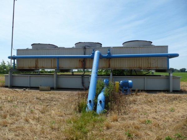 Delta Pioneer Forced Draft cooling tower (on roof) c/w plastic tank, blower & Tri-Clover s/s pump, 25 h.p., ser. no. 3306, (outside). THE INDIVIDUAL BID WILL BE OFFERED CONDITIONAL SUBJECT TO THE BULK BID LOT & AWARDED SOLD INDIVIDUAL OR BULK WITHIN 24 HOURS OF AUCTION CLOSE.