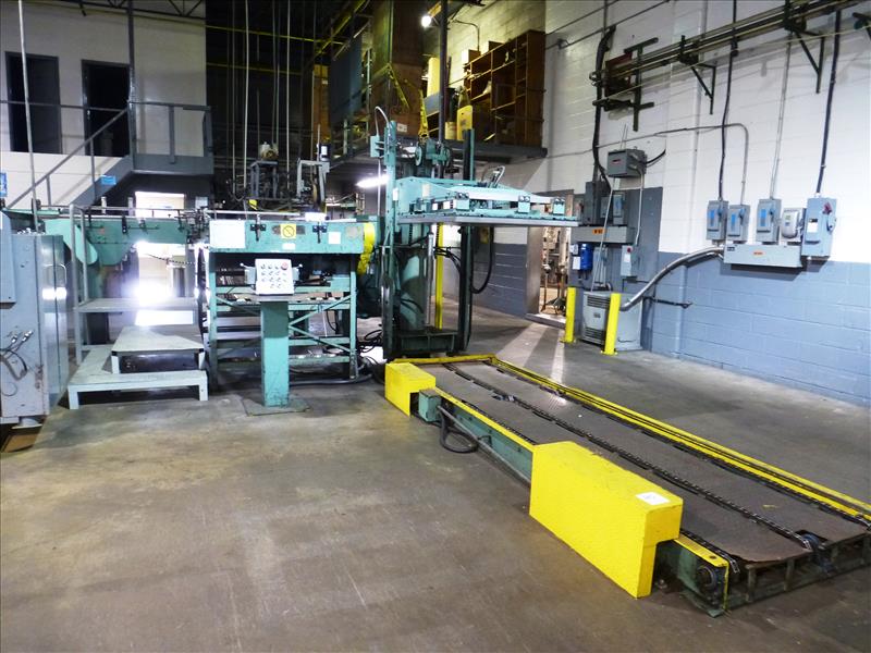 Whallon magnetic can palletizer/de-palletizer, mod. 7-87 Single-Filer, ser. no. 1912 c/w hydraulic power pack, pedestal console controls, triple chain pallet conveyor, slat belt accumulation conveyor, slat belt single file conveyor, approx. 15' L. can cable conveyor, can twisters