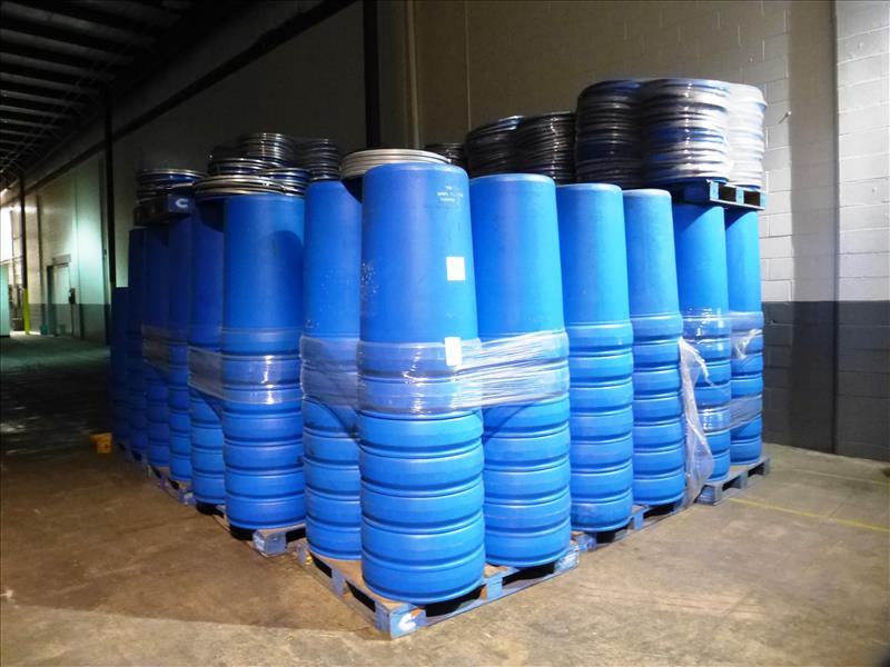 lot of Sonoco 55 USG. reusable plastic drums, No.055B c/w quantity of lids (roughly +/- 300 drums) (Not subject To Count)