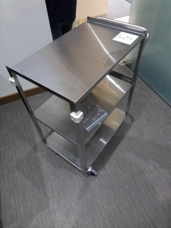 Portable stainless-steel cart. 3 shelves. 24 inches by 16 inch surface. Height is 16.5 inch.