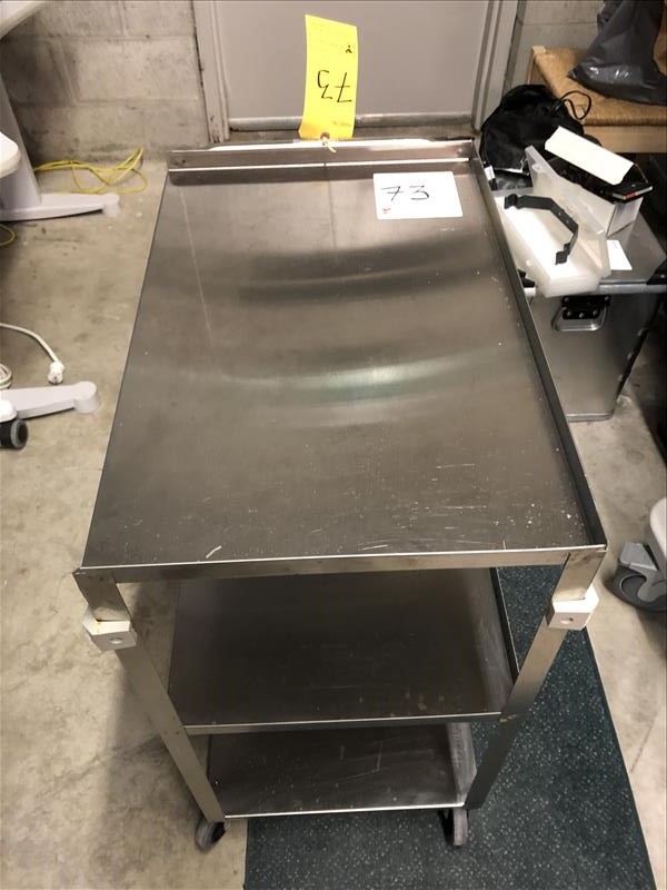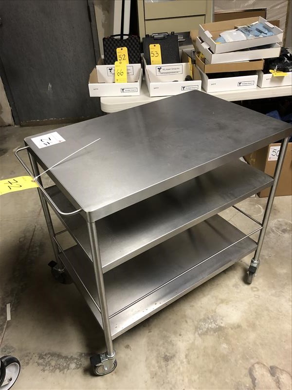 Portable stainless-steel cart 34 in H, 3 shelves, 22.5 in by 34.5 in surface area