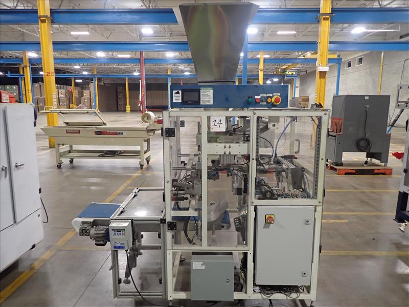 PackFlo vertical bagger form/fill/seal machine, ser. no. 20100802402AA, bag length 50-340 mm, bag width 80-260 mm c/w elevated belt exit conveyor, 24 in. x 6.5 ft