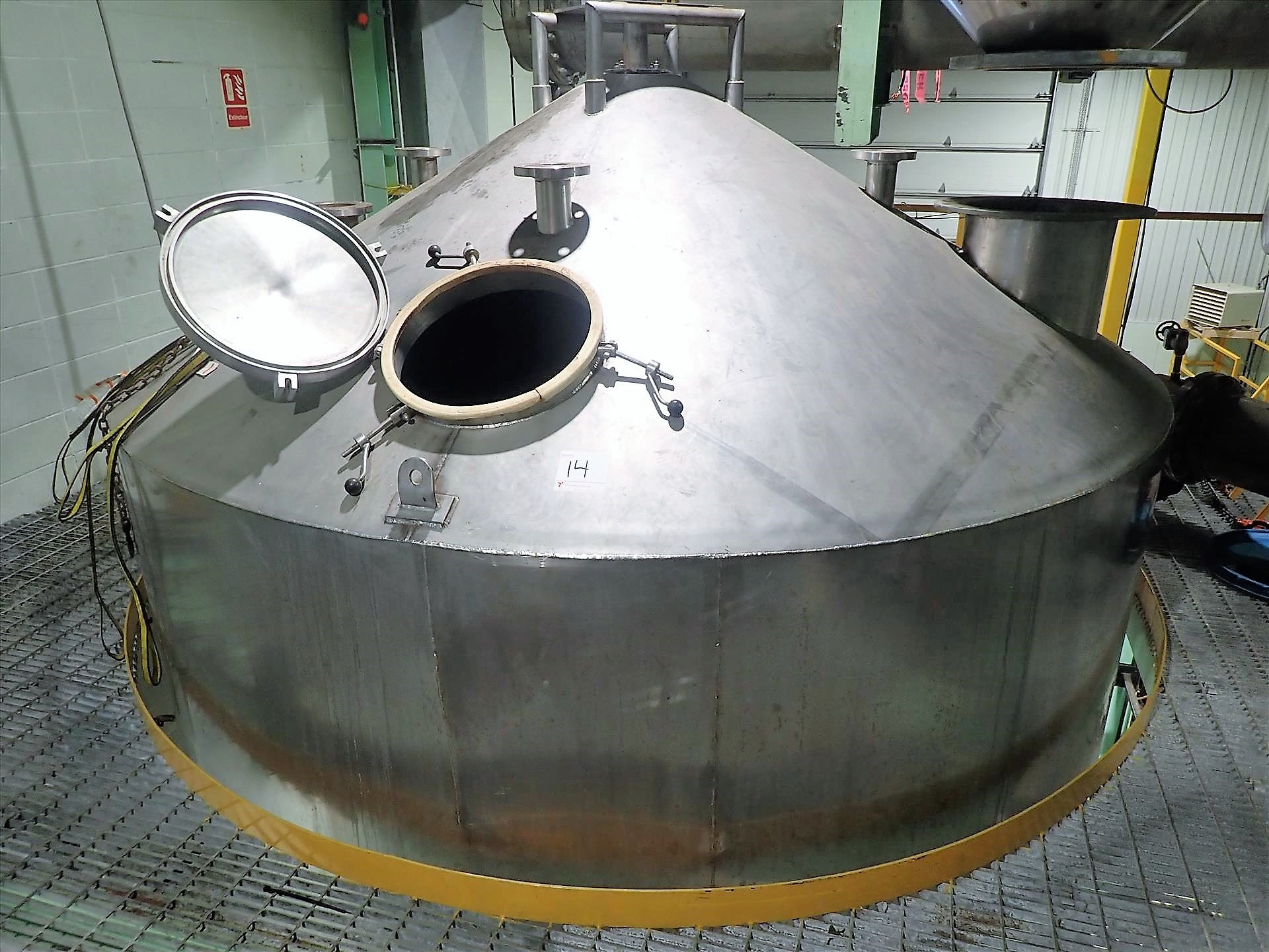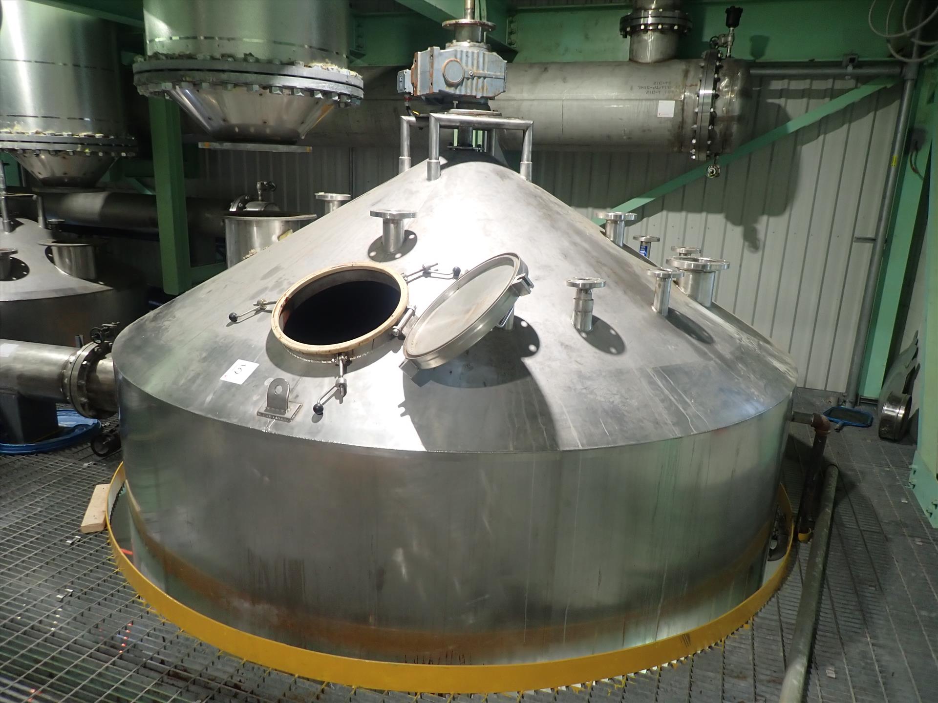 Inox-Tech Jacketed Tank 5400 gal., Stainless Steel, vertical. Internal rated 15 psi at 130 degrees F, jacket rated 150 psi at 400 degrees F. Top entering agitator with gearmotor, coned top and bottom. NO MFG TAG. Mounted (4) legs w/ load cells.