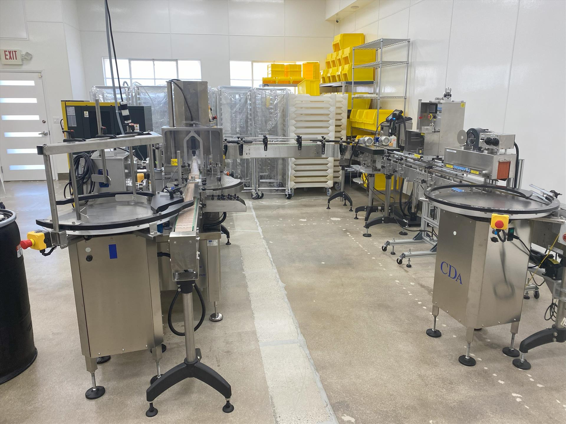 CDA 15/30 ml filling and labeling line (2021), incl.: E-Fill 2-head filler, 27.5 in. feeding table w/ loading tablet, VS400 capping station, PharmaFill NB1 neck bander w/ HT6B shink tunnel, Keyence MK-G Series ink jet coder, 160 mm label dispenser, 3.24 in. conveyor w/ VSD, PLC cabinet, HMI controls, pumps, sensors, starwheel, etc., stainless steel [Loc. Stockton, CA]